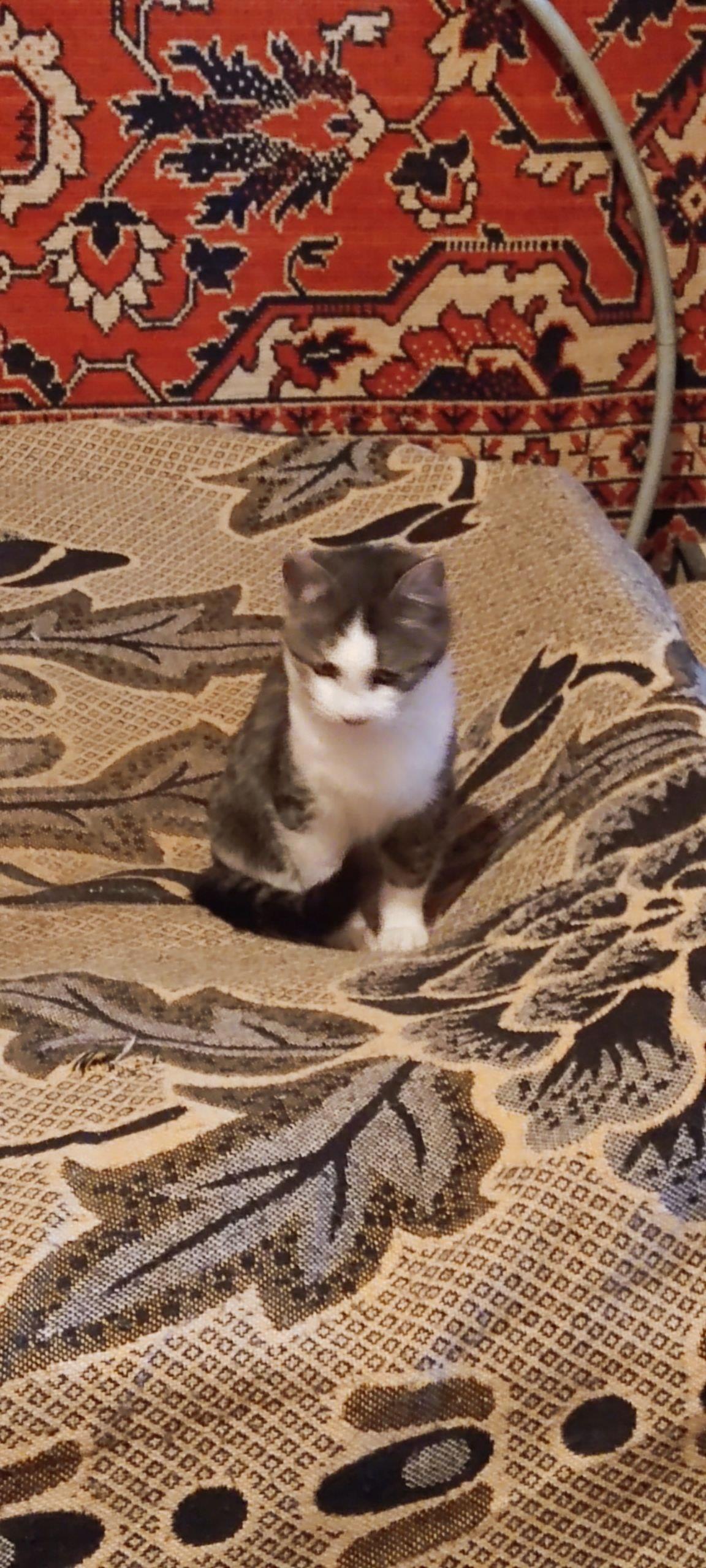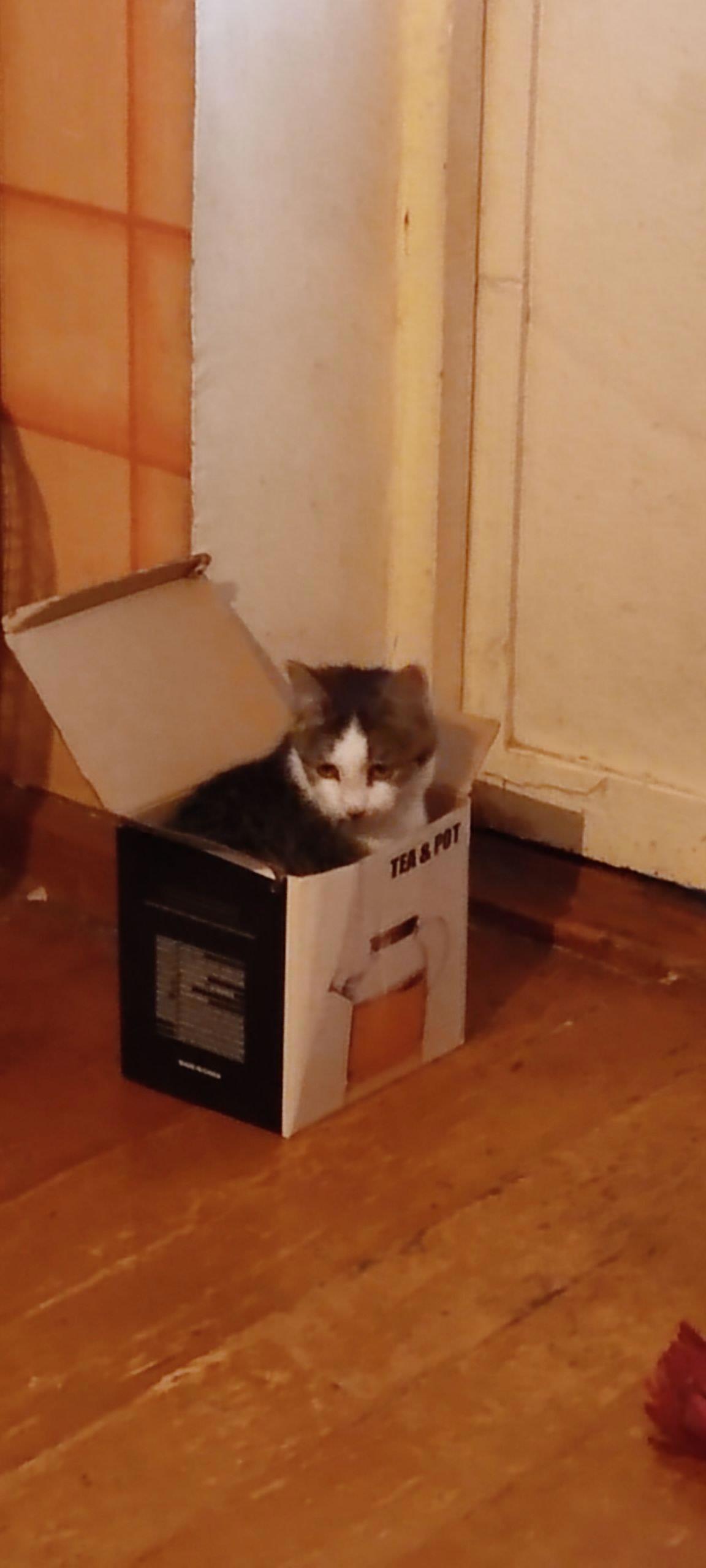 Она сначала всё в квартире изучила, так как всё новое, запахи чужие. Зачем притащили сюда - непонятно. Но потом развеселилась и стала играть. Особенно ей понравились коробочка, в которую она сразу залезла. Когда устала, отдохнула на диване.