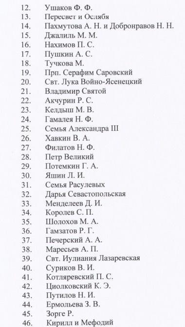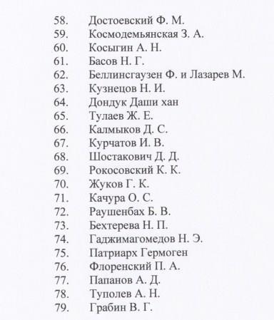 Это всё. 79 - ни больше, ни меньше. Сразу возникает естественный вопрос - а почему именно этих людей решено популяризировать в качестве образца для молодого поколения? Остальные недостойны?? Я задала такой вопрос организаторам конкурса. Ответ слегка шокировал - объяснений выбору просто нет.