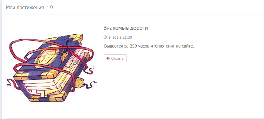 Давеча получила от сайта ачивку "Знакомые дороги". Даётся за 250 часов чтения на сайте. Это говорит о том, что я не только активно и много пишу, но и многое читаю, что тут публикуют. Это весомая награда для меня, говорящая о том, что я несмотря на то, что коммерческий автор, но и активный читатель.