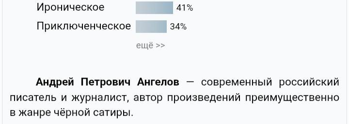 В оправдание могу процитировать админа - Ольгу Ворогушину (Андрееву), что составила мою биосправку для Фантлаба, в 2017-м. Вольга заявляет, что Андрей Ангелов - это автор в жанре чёрной сатиры.