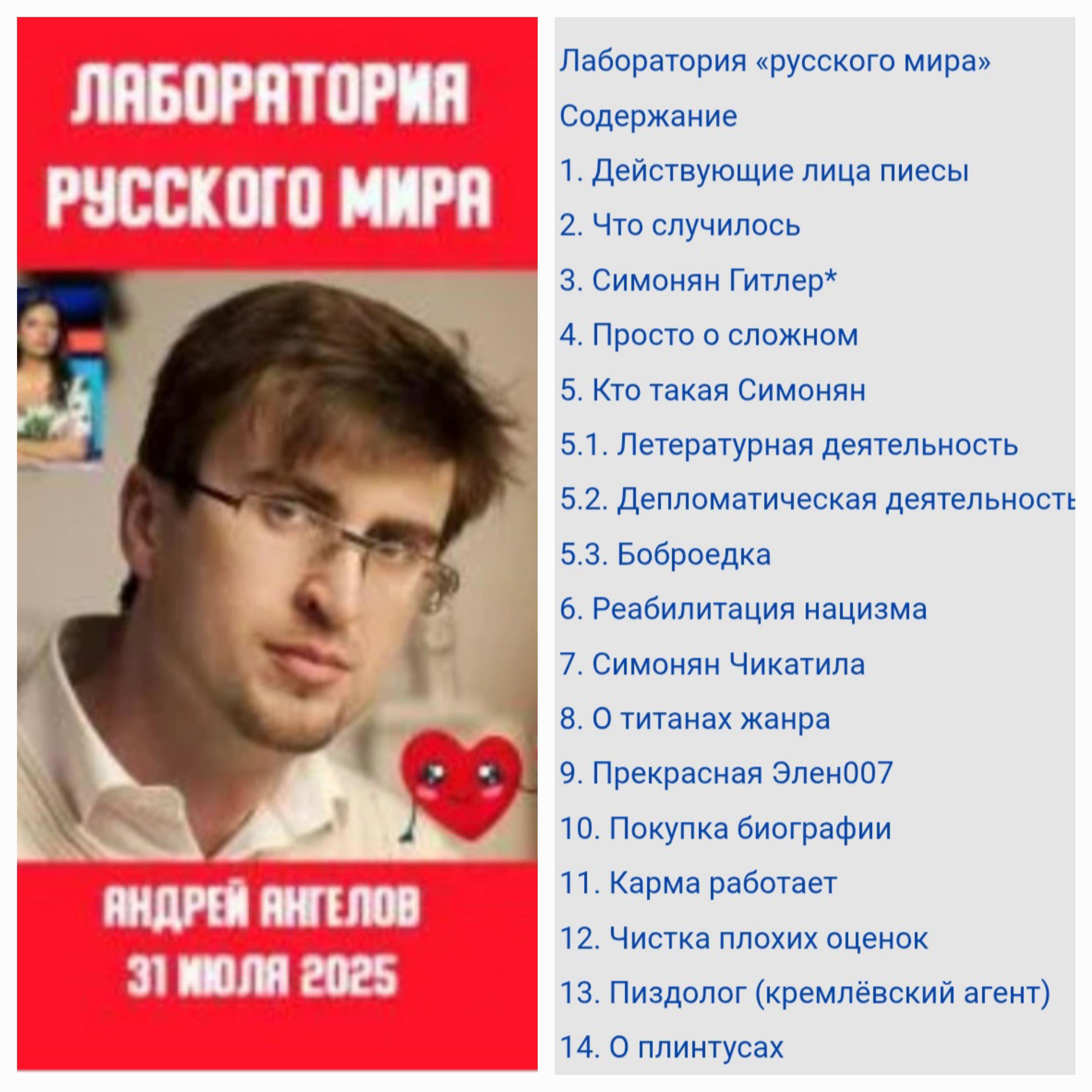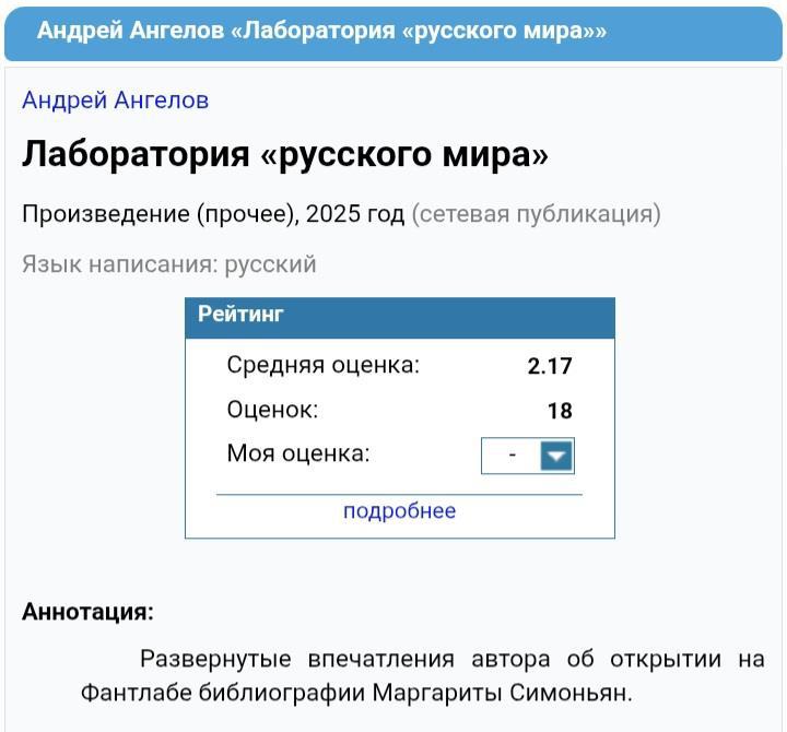 В августе 2025, автор выпустил небольшой памфлет "Лаборатория русского мира". Его прочитал кто-то из фантлабовцев, и книга сразу появилась в библиографии автора на ФЛ. И я даже знаю, кто прочитал и кто разместил.
