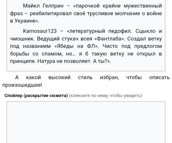 Как вариант, просто принизить автора как автора, в глазах других читателей. Мол, он прифарок (неологизм Ангелова, прим.), широко распиаренный, не более, - и писать о серьёзных вещах - не умеет.