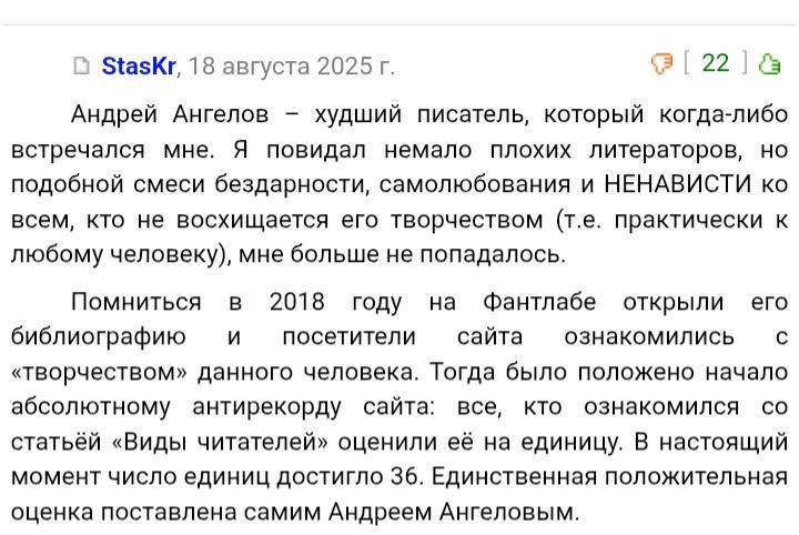 Возвращаясь к рецензии Стасика. Он упрекает Ангелова, в частности, в том, что тот не умеет писать некоторые слова. Мол, гений пишет их неправильно грамматически, ёпт. Тот, кто сам пишет "помниться" именно так, ахах...