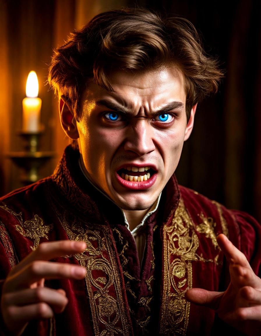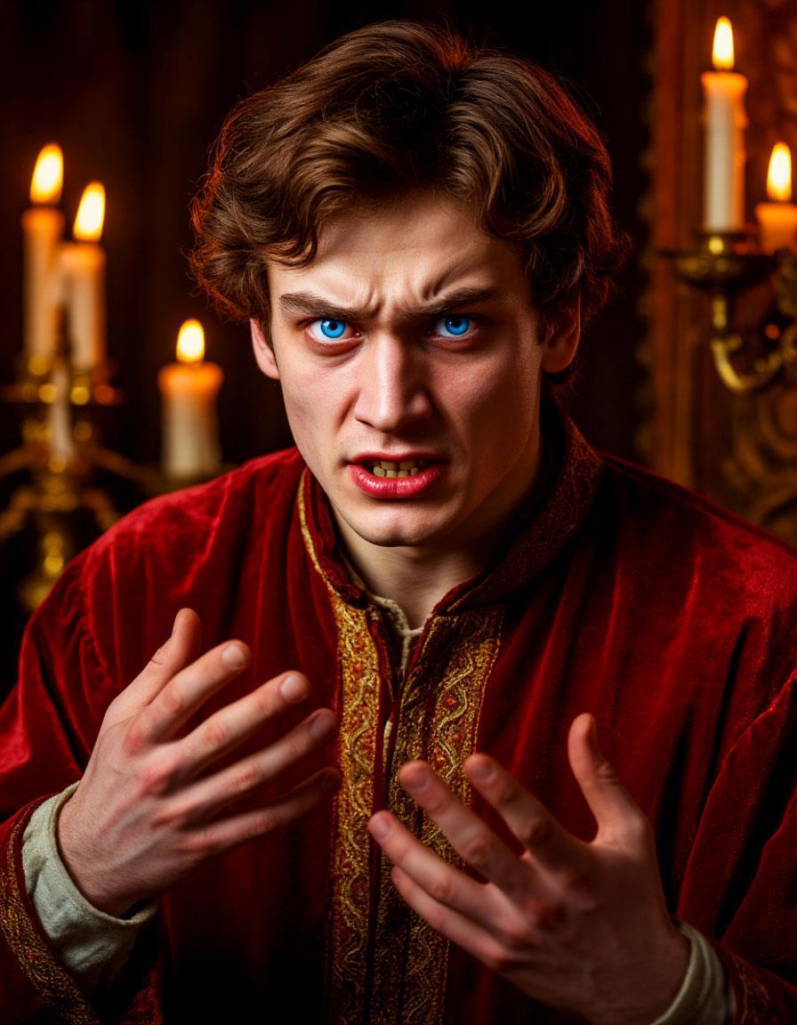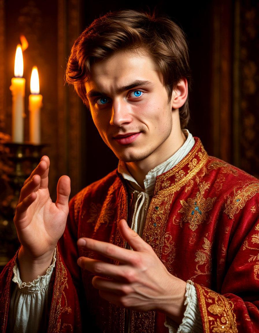 Россия, 17 век. Суровый нахмуренный молодой мужчина с ярко-голубыми умными глазами, коварным взглядом и русыми волосами произносит пламенную речь. Полуулыбка. Видны зубы. Волевой подбородок. Одет в боярский кафтан. Активно жестикулирует руками. Стоит внутри боярского дома. Позади пламя свечей. Часть лица в тени