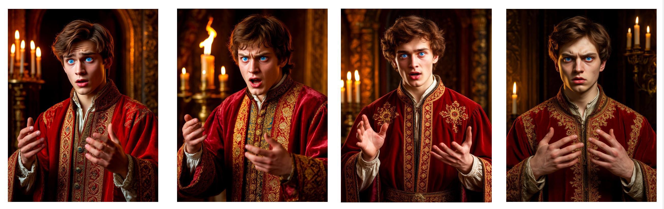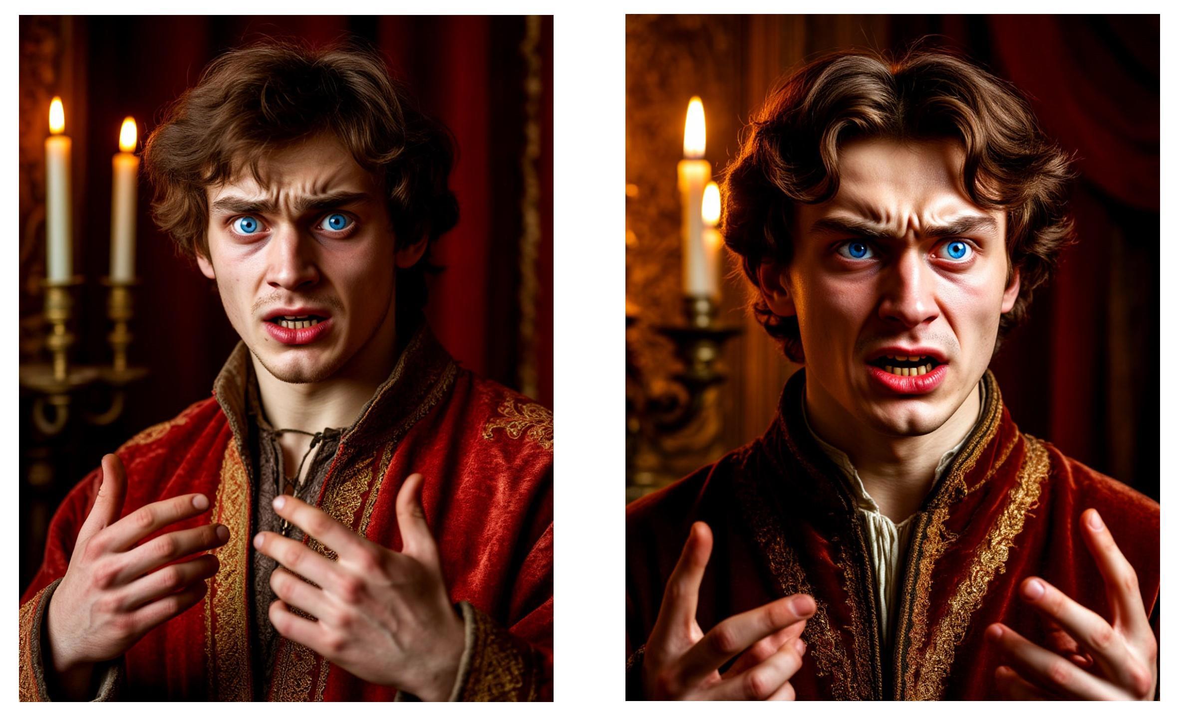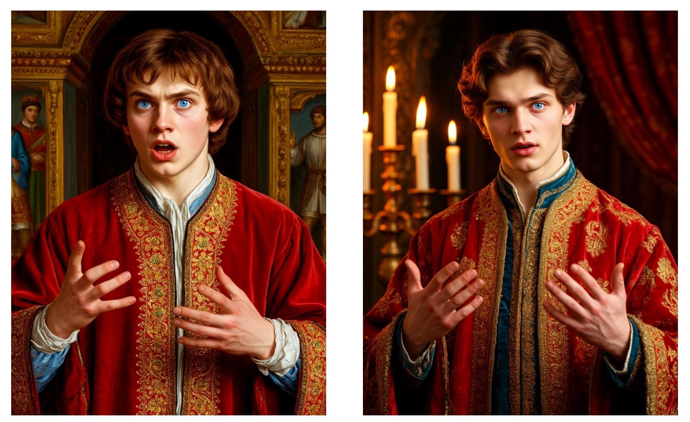 Россия, 17 век. Суровый нахмуренный молодой мужчина с ярко-голубыми умными глазами, коварным взглядом и русыми волосами произносит пламенную речь. Полуулыбка. Видны зубы. Волевой подбородок. Одет в боярский кафтан. Активно жестикулирует руками. Стоит внутри боярского дома. Позади пламя свечей. Часть лица в тени