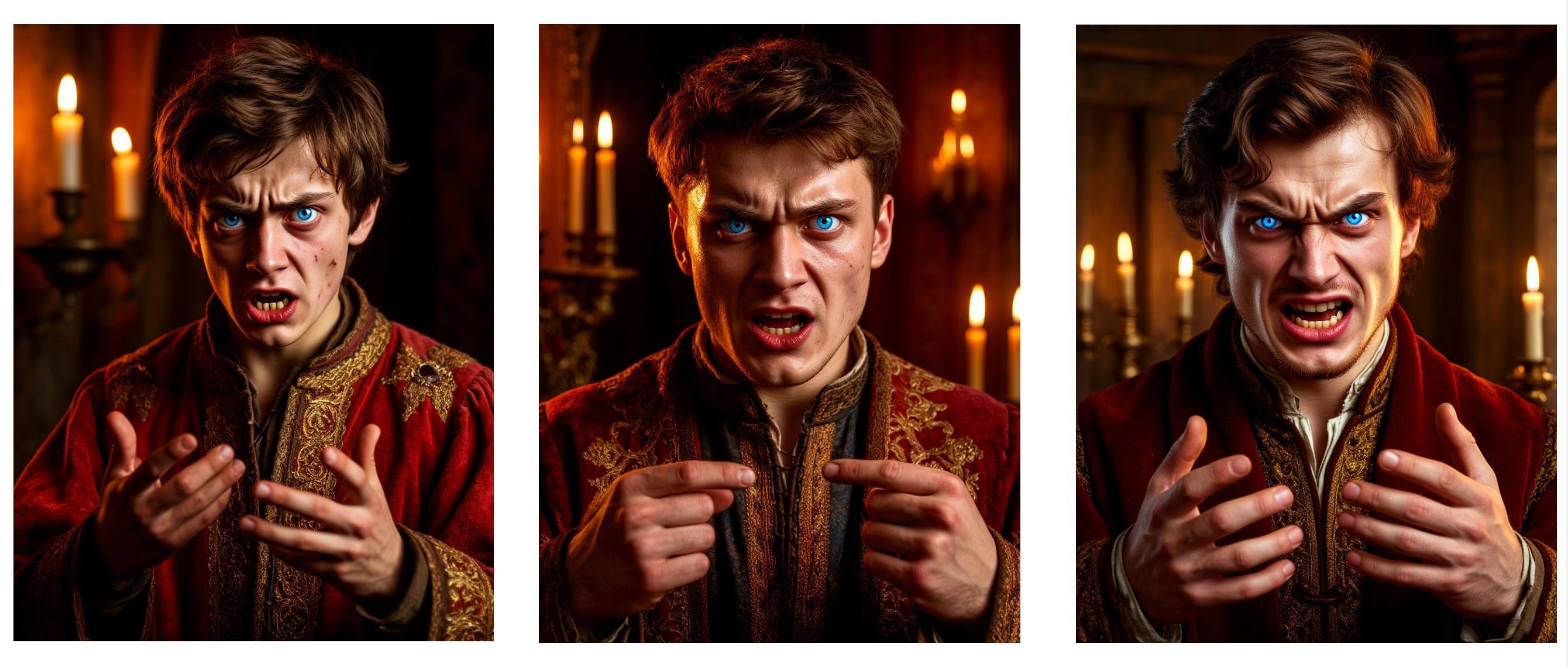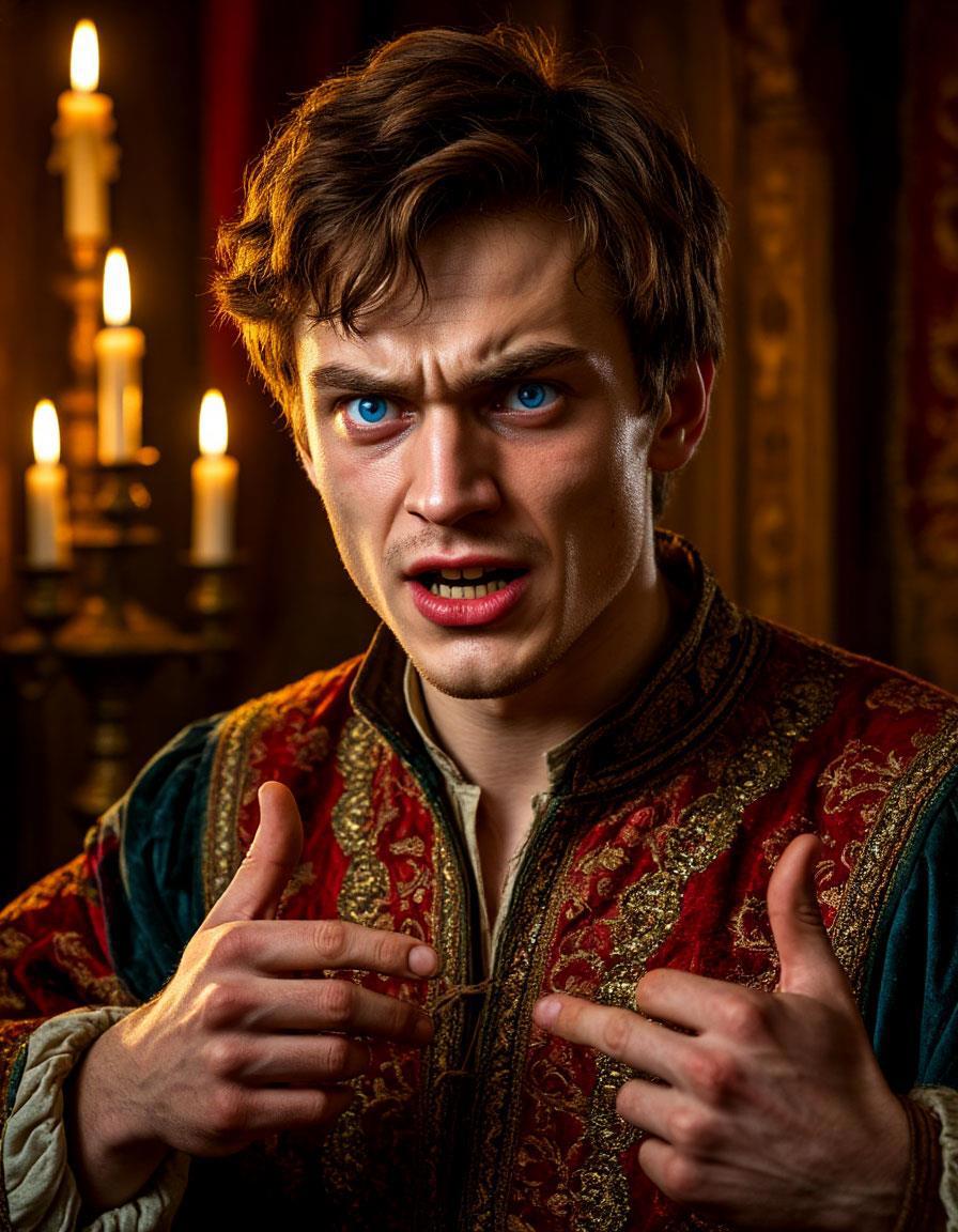 Россия, 17 век. Агрессивный нахмуренный молодой мужчина с ярко-голубыми умными глазами, коварным взглядом и русыми волосами произносит пламенную речь. Полуулыбка. Видны зубы. Волевой подбородок. Одет в боярский кафтан. Активно жестикулирует руками. Стоит внутри боярского дома. Позади пламя свечей. Часть лица в тени