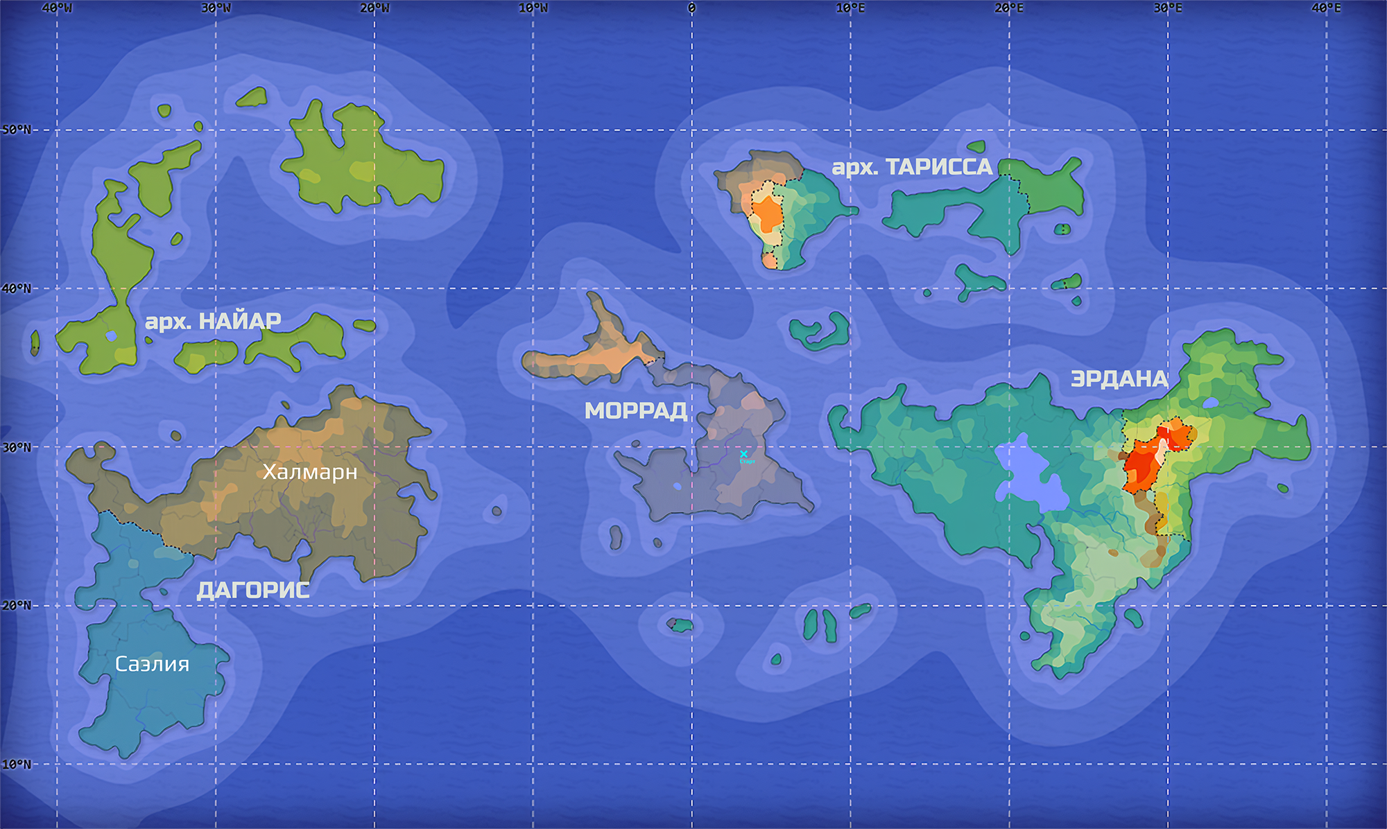 6 Государств: Моррад (место действия первого тома), Эрдана, Тарисса, Парящие Города (Найар), Халмарн, Саэлия.