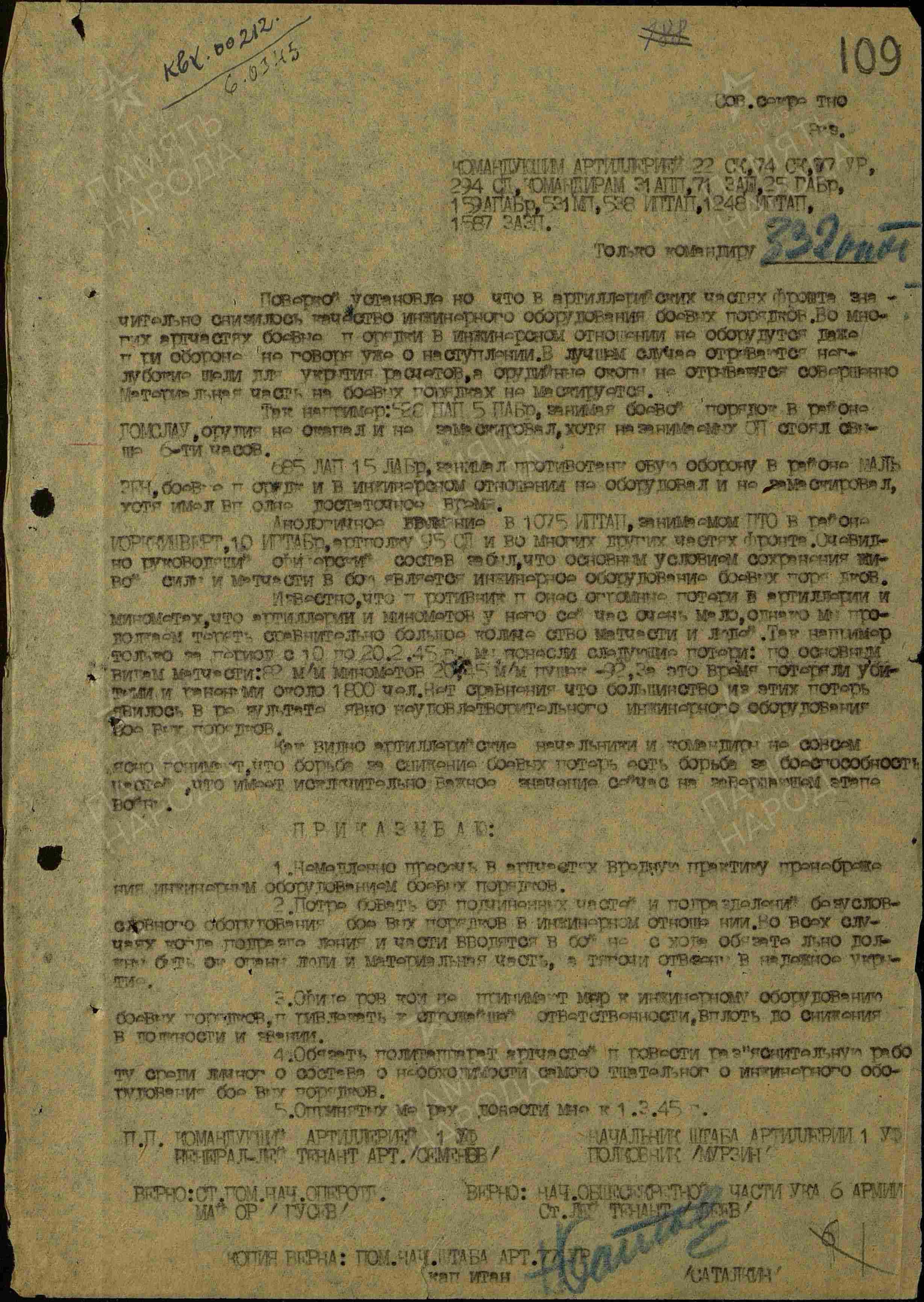 Так, например, только в период с 10 по 20.2.45 мы понесли следующие потери: по основным видам матчасти: 82 м/м минометов 20, 45 м/м пушке 92. За это время потеряли убитыми и ранеными около 1800 чел. Нет сравнения [так в документе, явно нужно «сомнения»], что большинство из этих потерь явилось в результате явно неудовлетворительного инженерного оборудования боевых порядков.