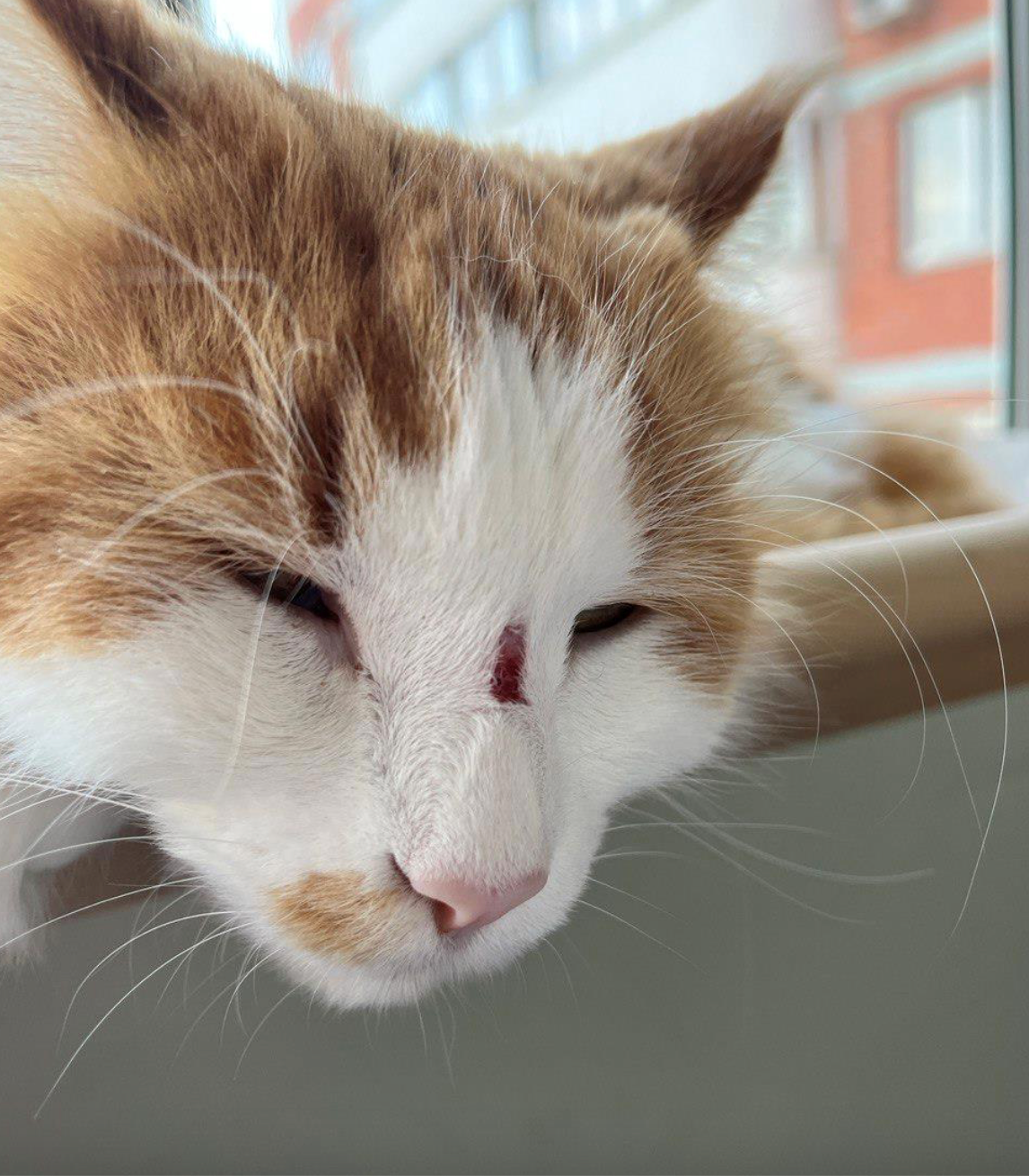 Ровно два года назад Кнопочка неудачно прыгнула с верхней полки гардеробной и ободрала переносицу. Урок был усвоен. Целый год она не залазила на полки в гардеробной, а ещё год не запрыгивала на самую верхнюю.