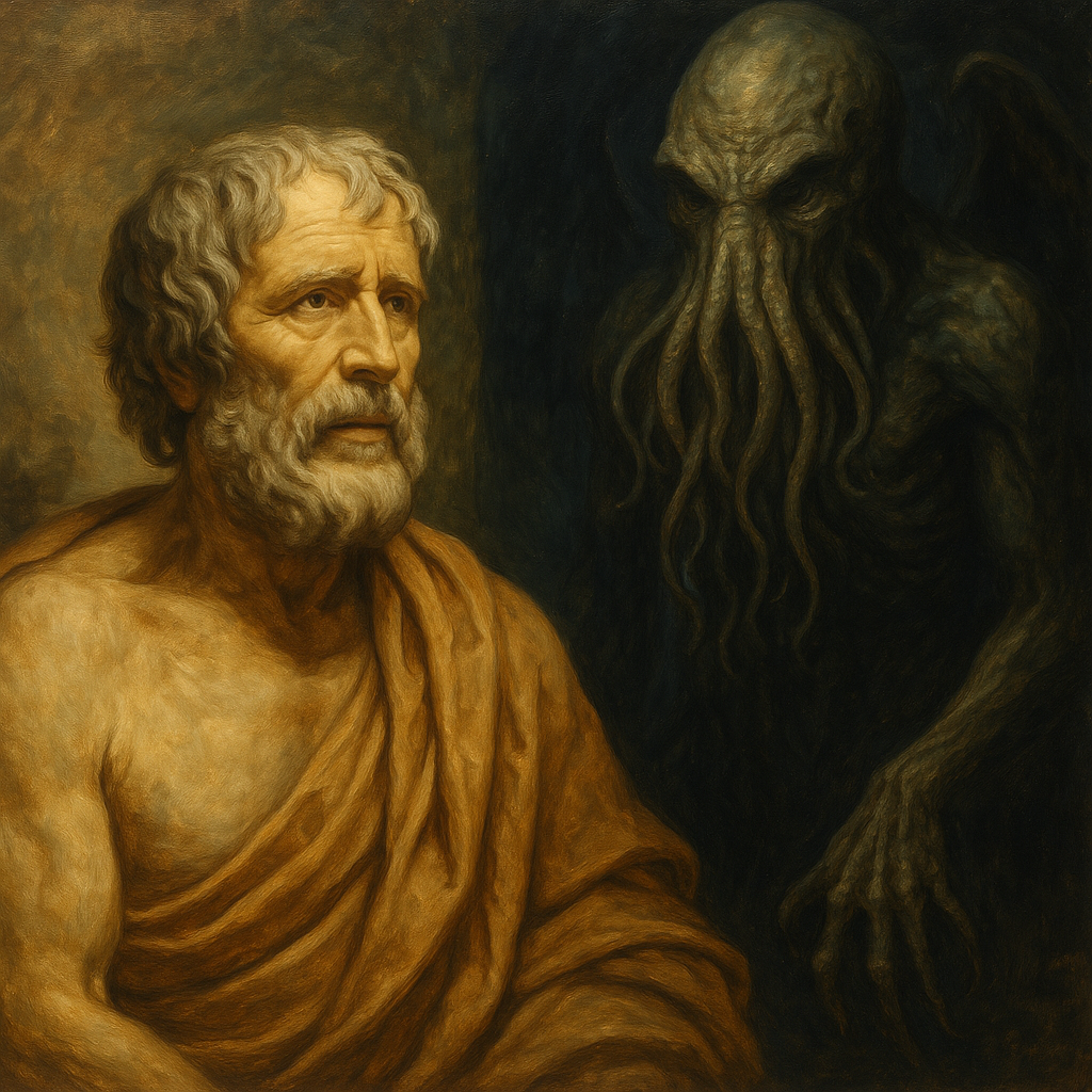 Сенека писал, что «страдание от мыслей страшнее страдания от вещей». Именно это испытывает Алексиос: его не убивают чудовища, его мучает мысль, что порядок мира — иллюзия. Но он не сходит с ума, как герои Лавкрафта. Он остаётся собой, опирается на рассудок, даже когда рассудок рушится. В этом и заключается стоическое преодоление ужаса — не победить, а выдержать. Поэтому я оставил в тексте искру человеческого света. В момент, когда рушится порядок, остаётся то, что сильнее страха — прикосновение, любовь, связь двух живых существ. Это — единственный ответ человека на равнодушие вселенной.