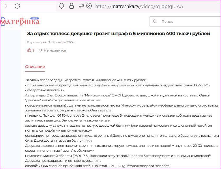 Автор видео Oleg Dogtor пишет: На "Минском море" ОМОН дерется с девушкой и мужчиной на костылях! Одной "дамочке" лет 45-ти (уж женщиной ее язык не поворачивается назвать) с детьми не понравилось, что на Минском море (район неофициального нудистского пляжа) женщина загорала с открытым верхом. Она вызвала милицию. Пришел ОМОН, сперва 2 человека (потом еще 5), подошли к женщине и сказали собирать вещи, за нее заступилась девушка. Эти служители закона начали хватать девушку за руки и тащить по песку, с девушкой был муж (или парень) на костылях со сломанной ногой, он попытался подойти и выяснить на каком основании, не представившись они куда-то ее тянут! Долго не думая они начали толкать этого бедолагу на костылях и бить. Даже достали газовые баллончики! Девушка в шоке, на нее надели наручники, вызвали скорую помощь для нее и ее парня! Минут через 20-30 приехала скорая и непонятная "газель" с обычными номерами минской области (0801 IP-5)! Затолкали в эту "газель" человек 5 кто заступался и знакомых-свидетелей! Девушка пострадавшая и ее парень уехали на скорой! Избивают народ ни за что, в том числе калек и женщин... Надевают наручники. Насильно увозят и помещают в "обезьяник". Не дают пить и нормальной еды. Лишают свободы без всякой вины. Помимо пострадавшей девушки (синяки), пострадали ещё пять человек. Я все понимаю, но люди должны оставаться людьми, особенно это касается милиции и т.п., которые кормятся за счет народа! Наверное в стране проблем нет, если 7 ОМОНовцев прибежало, чтобы наказать женщину, которая загорала "топлес"! А если у какой-то женщины случайно при купании при нырянии с маской лифчик за что-то зацепился и порвался и проходящий мимо мент увидел её сосок или край ареола соска, то он тоже захочет кинуть за это эту женщину на миллионный штраф? Как страшно в кое-какой стране быть женщиной!