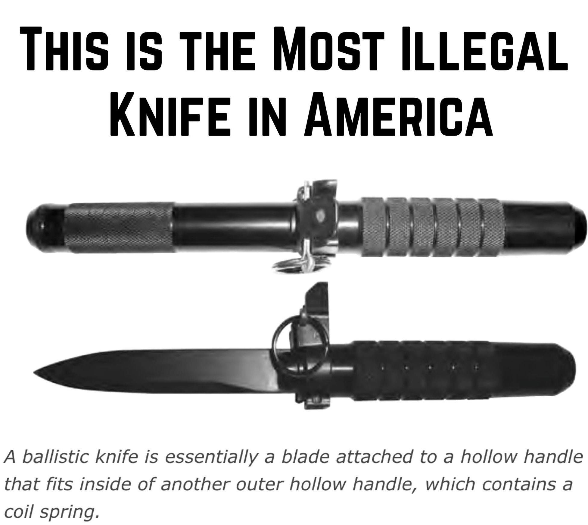 «Выслушав неподтвержденные показания свидетеля из Конгресса о том, что баллистические ножи могут быть использованы для поражения бронежилетов, которые обычно носят полицейские, и став свидетелем постановочной демонстрации против мишени с деревянной подложкой, сенатор Альфонс Д'Амато из Нью-Йорка представил Закон о запрете баллистических ножей, законопроект о запрете продажи или хранения баллистических ножей. В конечном итоге законопроект провалился. Однако после получения поддержки сенаторов Строма Термонда из Южной Каролины и Денниса ДеКончини из Аризоны поддержка Конгрессом запрета на импорт или хранение баллистических ножей быстро набрала обороты. В сентябре 1986 года сенаторы, поддерживающие запрет баллистических ножей, присоединили свой законопроект к популярному законодательству, направленному на искоренение наркотических культур в зарубежных странах и прекращение международных операций по незаконному обороту наркотиков. Впоследствии законопроект был принят в качестве закона.»(с)их вики.