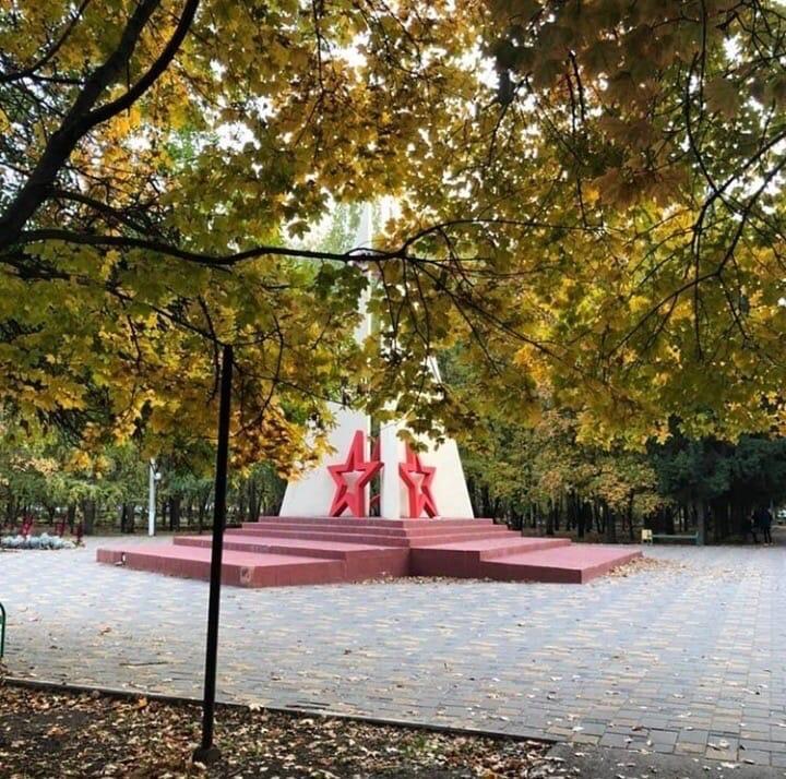 Жёлтое и чёрное, серое, голубовато-зелёное, багряное, палитра сквера кажется скромной, но оттенки этой скромности душещипательно разнообразно хороши. А в центре, светло-бетонные, с красными звёздами по низу и 1941-1945 поверх, смотрят ввысь те самые треугольники фронтовые писем. Много лет назад, когда мой дед взял меня на сорок лет Победы, мой будущий учитель, подаривший любовь к рисованию и графике, Паллеонидыч, Павел Леонидович Ураткин, придумал эту память о войне, и она, эта память, как-то сразу стала своей, нужной, обязательной и уже невозможной без неё. Такое случается и это здорово.