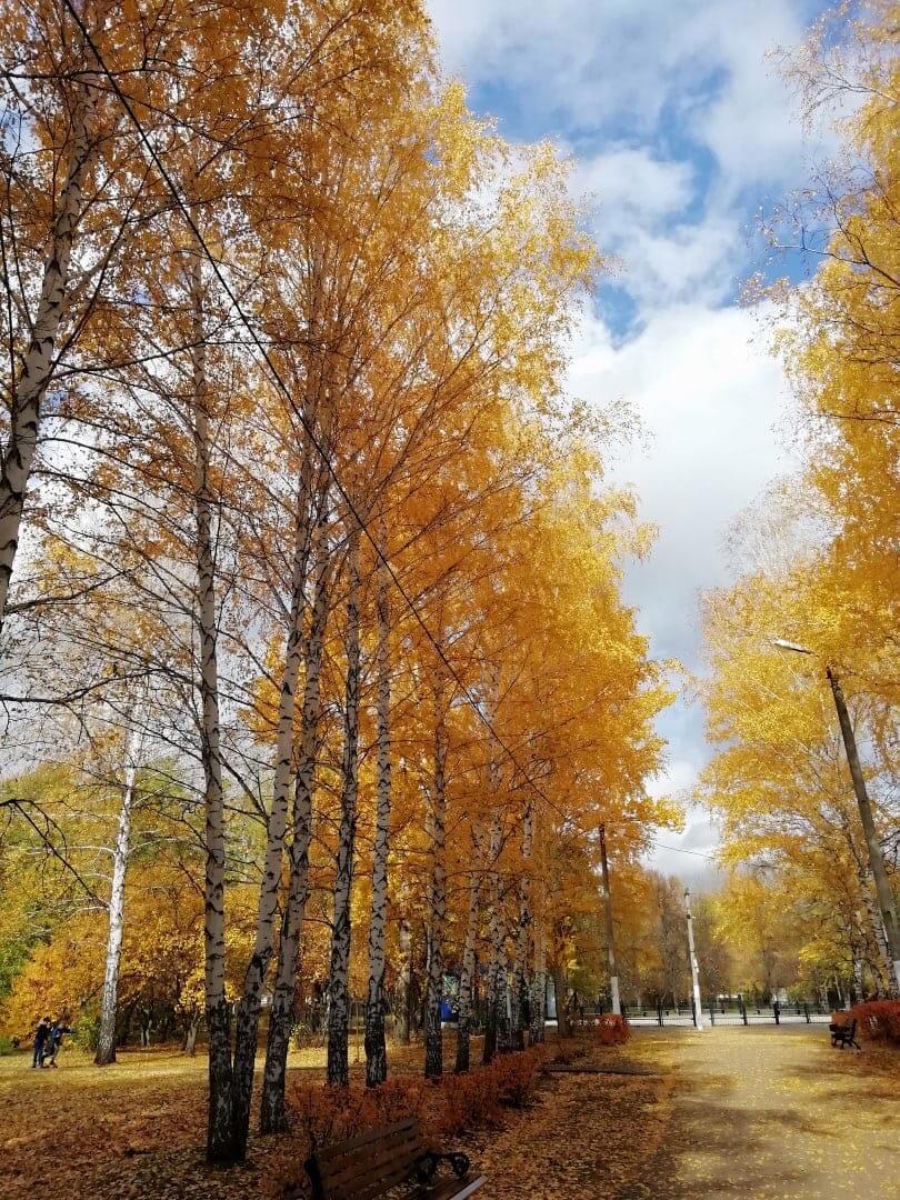 В прошлую субботу сквер стал самым красивым местом за неделю, победил обожаемые развгодошние золотые клёны у работы, ало-багровый вьюнок по забору старой школы у Космопорта и прочие отгоревшие костры рябин. Старый сквер, полный октябрьского солнца, вороха листвы, разбегающейся от ветра жёлтыми волнами и от него же, вдруг налетевше-холодного северного, облетающий золотым листопадом. Здесь не так много деревьев, особенно после вырубки лет пять назад, но они есть, а ещё они уже подросли, высаженные тогда же. Здесь много клёнов, чуток обычных и побольше канадских, здесь тут-там уже опавше-облетевший боярышник, здесь есть парочка-другая молодых дубков, здесь кружком колют небо сосны с голубыми елями аллейки к памятнику, здесь кроме стального забора гордо высится прямоугольник пирамидальных могучих тополей, здесь ещё осталось местечко карагачам и здесь много, очень много, высоких стройных больших берёз, царапающих налетевшие серые тучи.