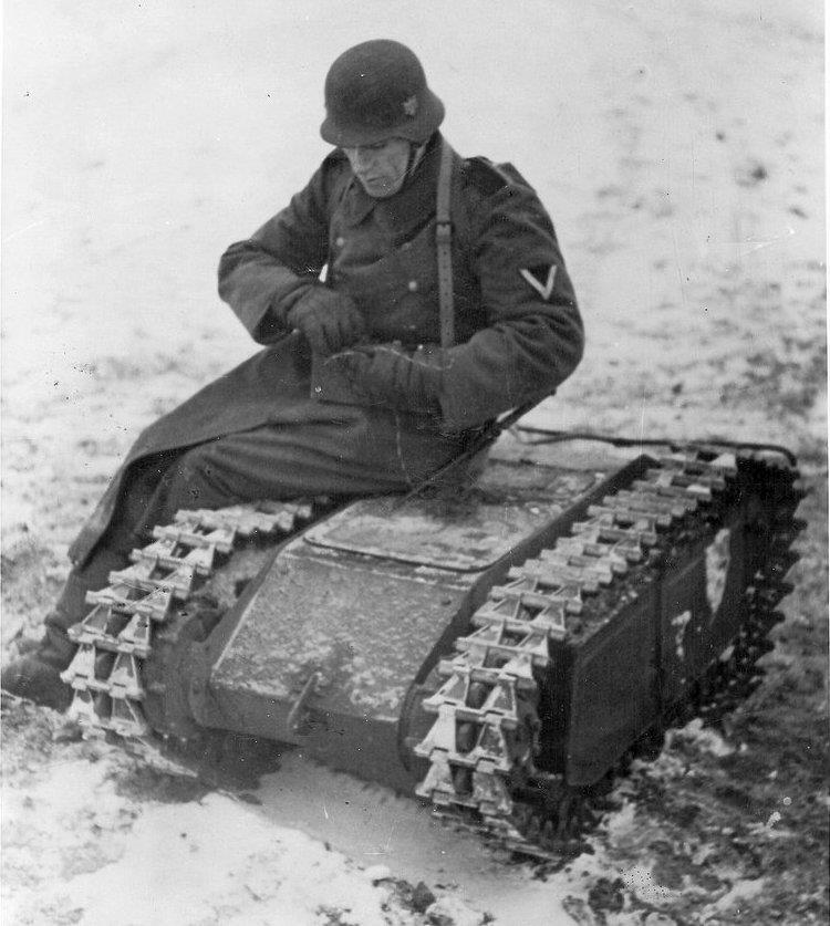 Самый известный широкой публике вариант управляемого немецкого сухопутного оружия был малыш Sd.Kfz.302 «Goliath» весом 370 кг с двигателем в 29 л.с. и скоростью до 5 км в час. Он мог управляться как по радио, так и по кабелю (основной вариант) на расстоянии до 700 метров. По сути, это была сухопутная торпеда с зарядом до 100 кг, разработанная на основе французской Kergesse. Был вариант с электромотором и с ДВС. Такая самоходная мина промелькнула в нашем фильме про штурм Берлина. Вот грустный немец сидит на своём оружии с пультом управления в руках: