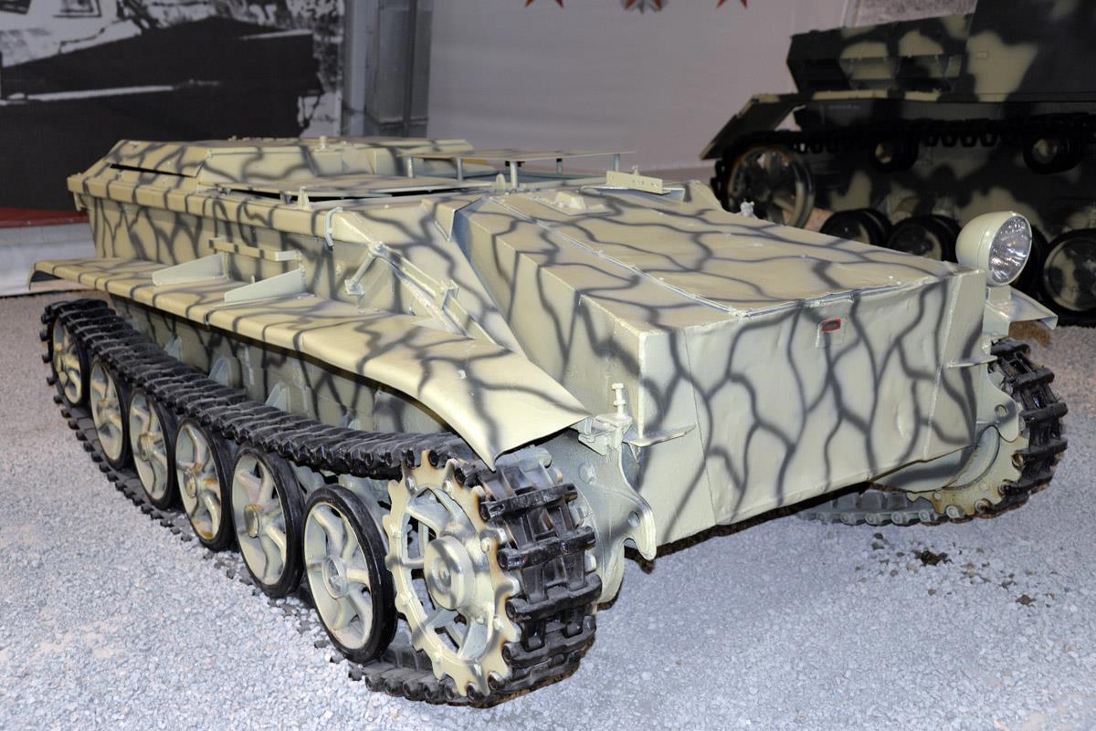 Серёдку в этом ряду занимал «Призрак» или по-немецки SD kfz 304 springer весом 2,4 тонны и двигателем в 37 л.с. По сути, это была задняя часть от очень своеобразного полугусеничного немецкого мотоцикла. Их сделали около 50 штук и так и не решили, что с ним делать – как самоходная мина он никуда не годился. За квадратной коробкой скрывалось место водителя с велосипедным рулём, между прочим. Редкая штука: