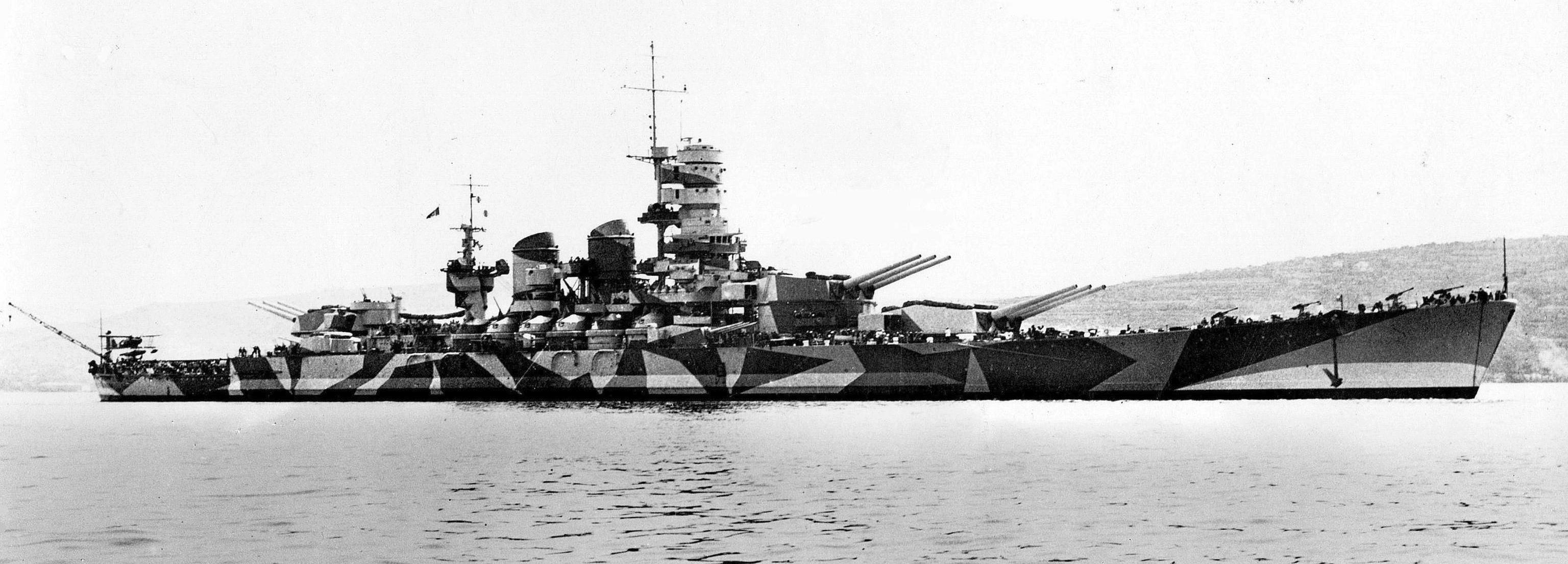 У немцев получилось получше, хоть и ненамного. Дело было так. В начале осени 1943 года Италия была выбита из войны, и куча её кораблей спокойно стояла себе на рейде, никого не трогала. В этой куче самыми заметными были два новейших линкора типа «Литторио»: один «Италия» (собственно, он и есть бывший «Литторио»), а другой прозвали «Рома». Вот он, этот могучий красавец: