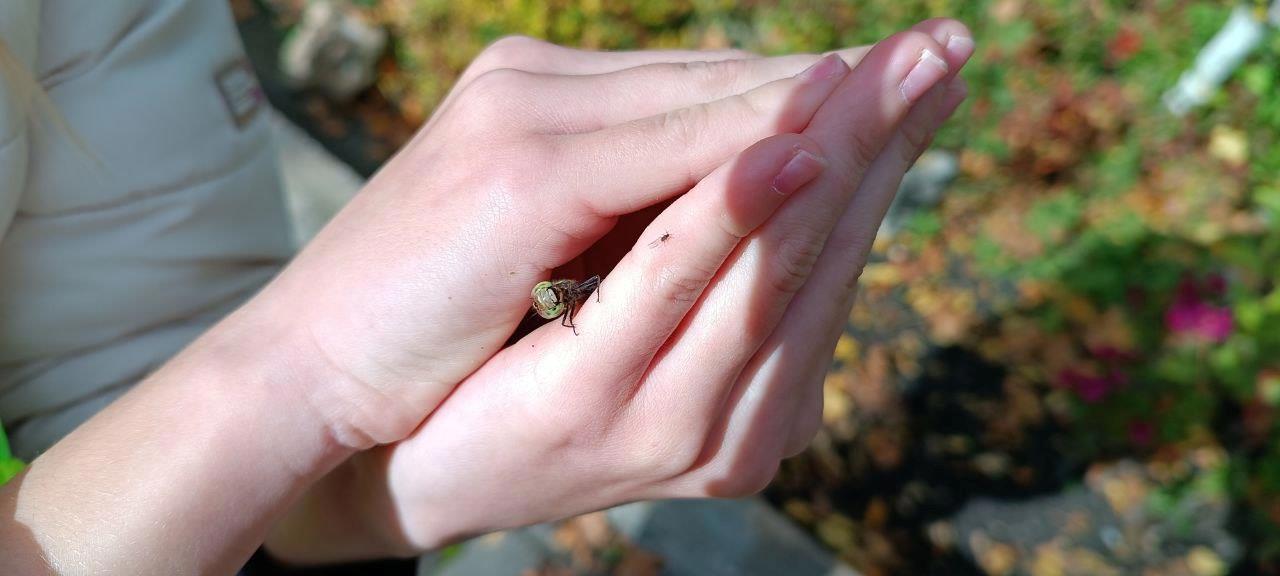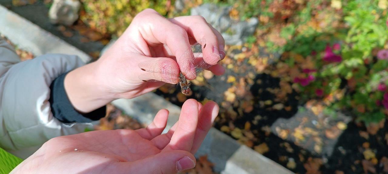 Но тут мы увидели стрекозу, которая лежала пластом на тротуарной плитке. Влада решила, что ей стало плохо от осени. и решила пересадить ее на цветок. Стрекоза оказалась живой! Влада осторожно расправила ей крылышки и она ожила!