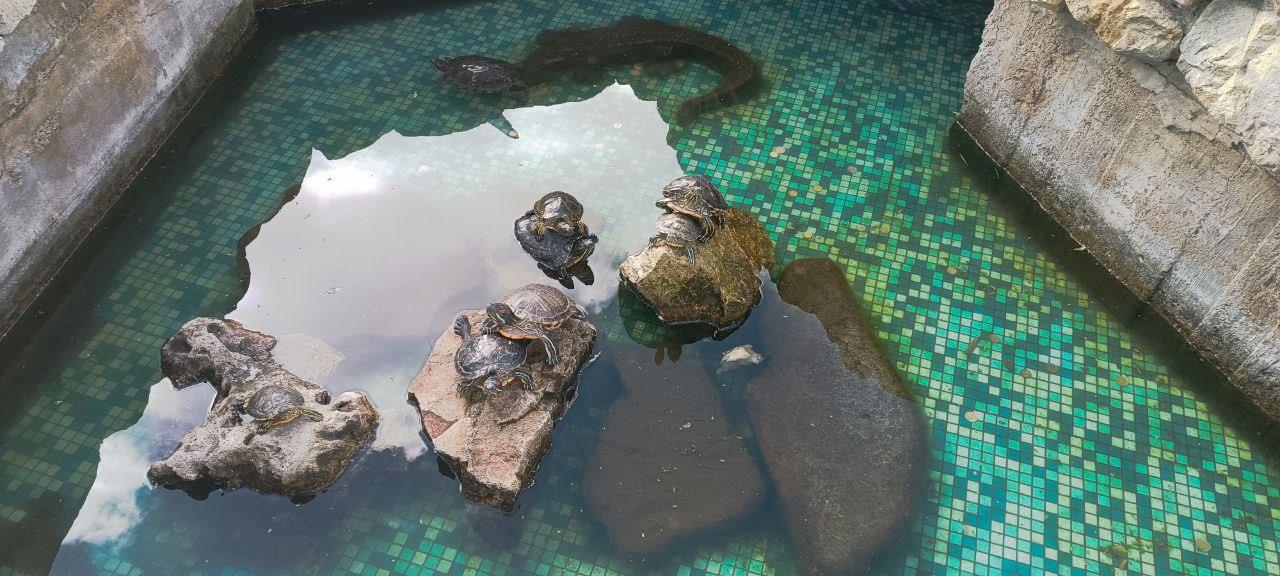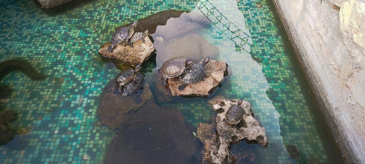 Удивили черепахи. Они обычно плавали или просто лежали на камнях и редко у кого была видна голова при этом. А сегодня они как по команде вытянули шеи и оставались в таком положении неподвижно.