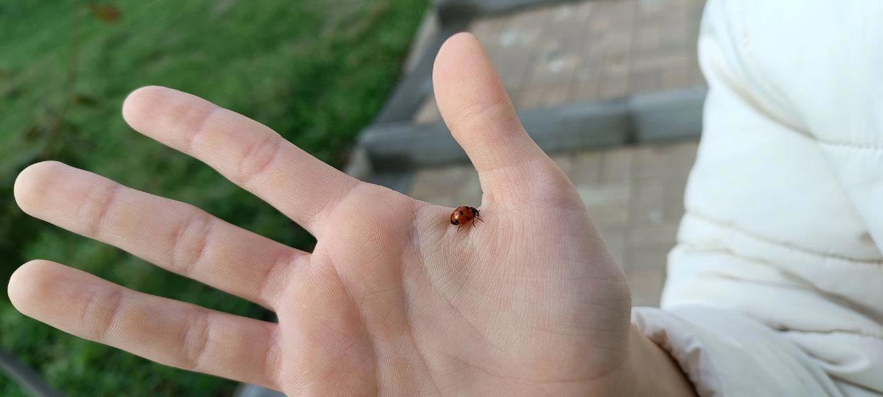 А в завершении нашего променада, на Владу села божья коровка и не спешила улетать! Просто лето на ладошке!