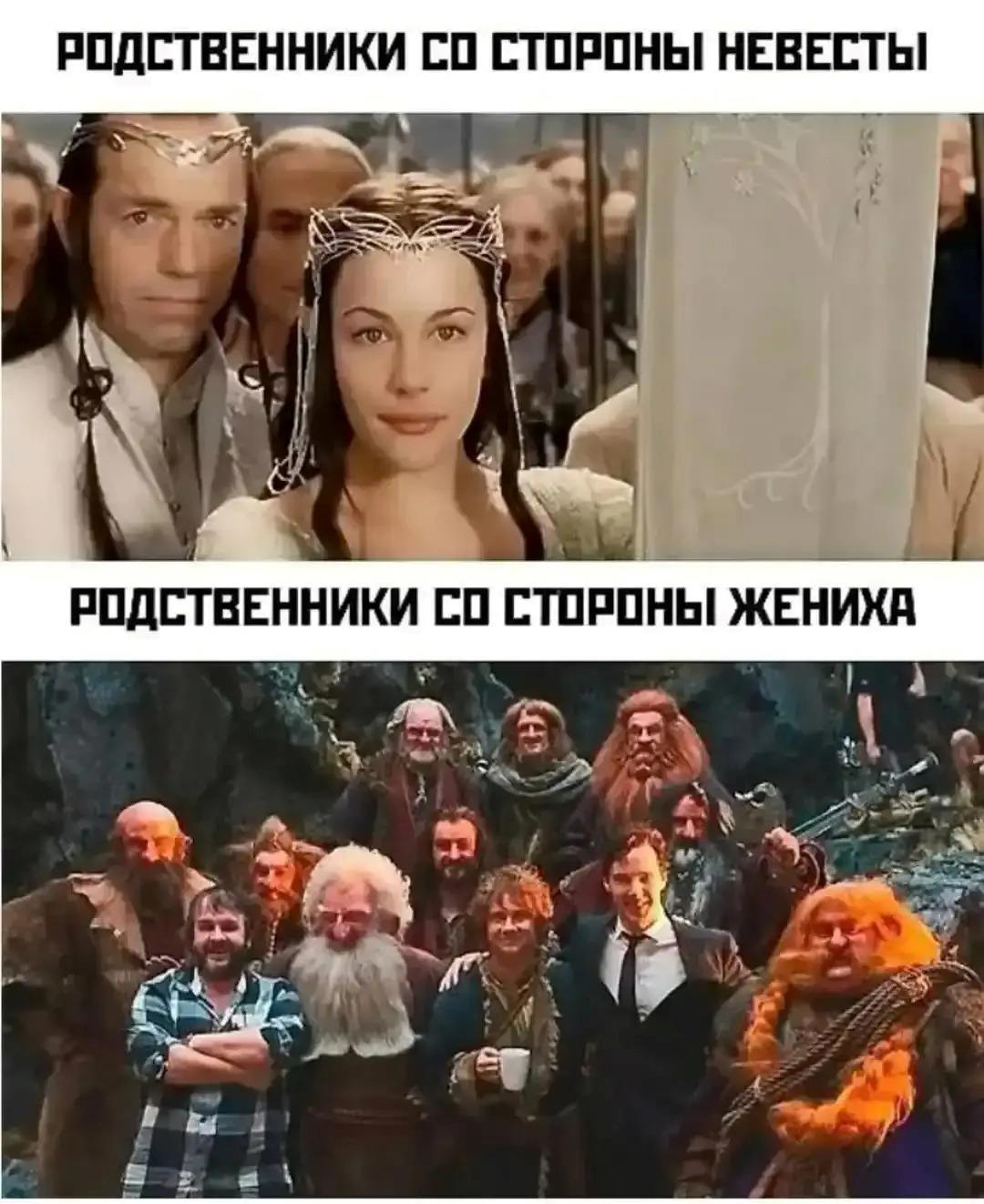 Подумал, что её автор явно считает, что великолепие первых проигрывает жизнерадостности вторых. Но, по-моему, эльфы и в великолепии проигрывают: ну кто будет восхищаться их длинными ушами, белыми одеждами, золотыми украшениями и привычной красотой Лив Тайлер, если на стороне гномов — целый дракон Камбербэтч и даже ещё более целый режиссёр фильма?!