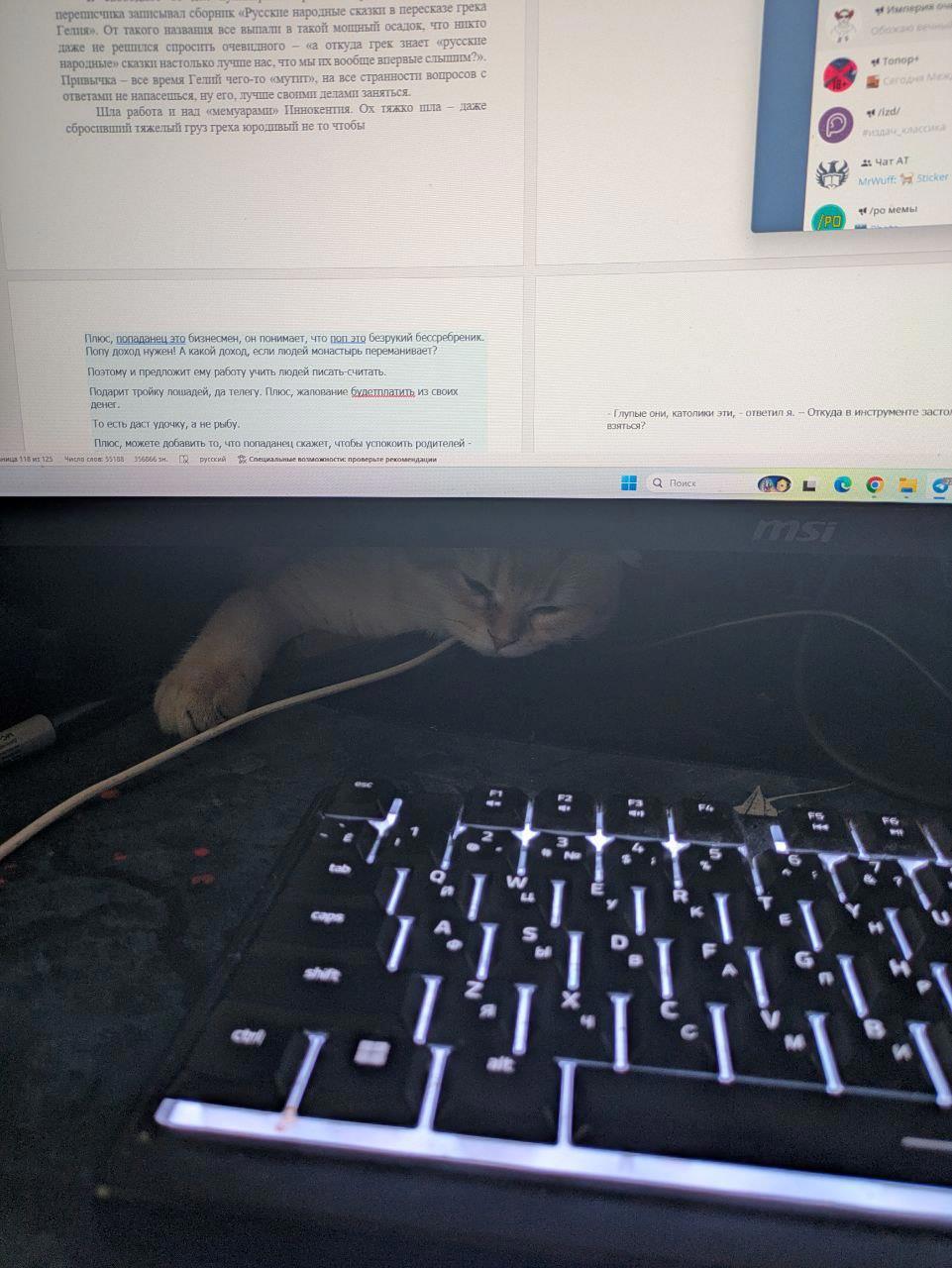 Автор: Смолин ПавелУх и радуюсь я животинке своей! Всё, полностью приручилась, обжилась и даже успела немножко заруинить квартиру. Ничего, это нормально, нет в зверюше зла, просто ей интересно иногда чего-нибудь заруинить. По утрам у нее пик активности, поэтому сначала она меня отвлекает от работы, а потом смиряется с тем, что это не получится, и единственный способ поиграть пораньше - это дать мне спокойно закончить, а еще лучше - помочь. Вот так помощь выглядит: