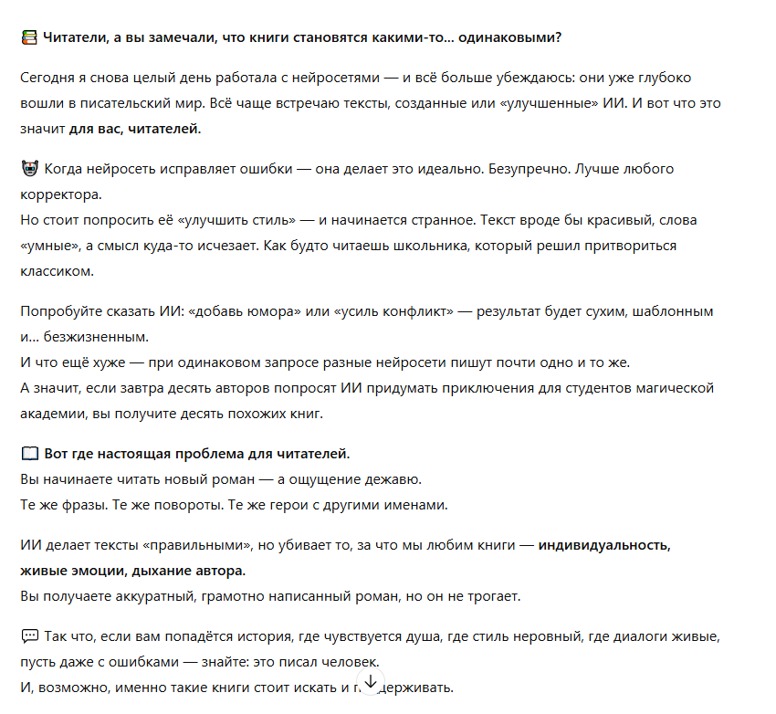 Здесь приложена картинка, как ИИ переработала вот этот самый пост так, чтобы он был обращен к читателю, а не к автору. Чувствуете, шаблонность текста? Те, кто работает с ИИ может угадать эту интонацию, как знатоки Толстых отличат текст Льва Толстого от Алексея Толстого.