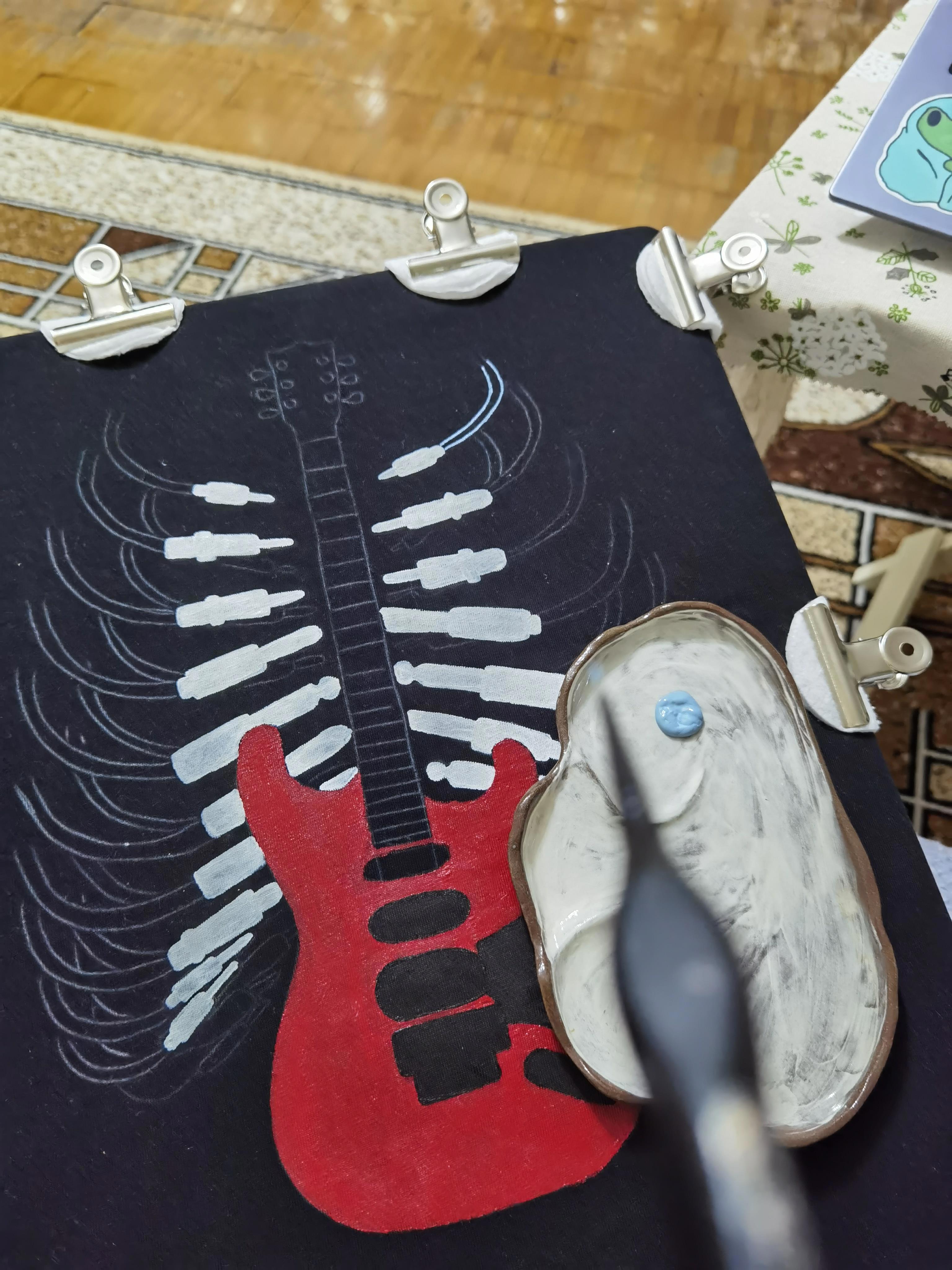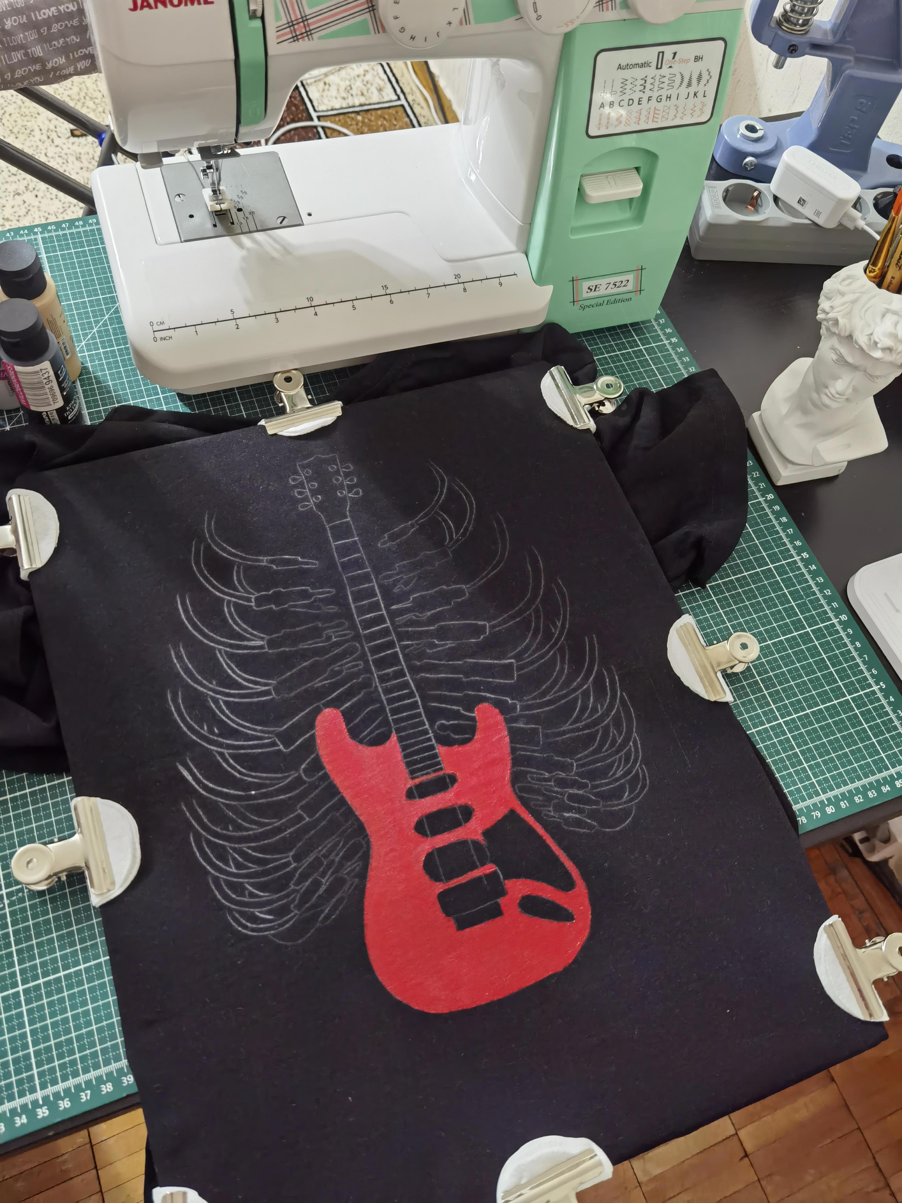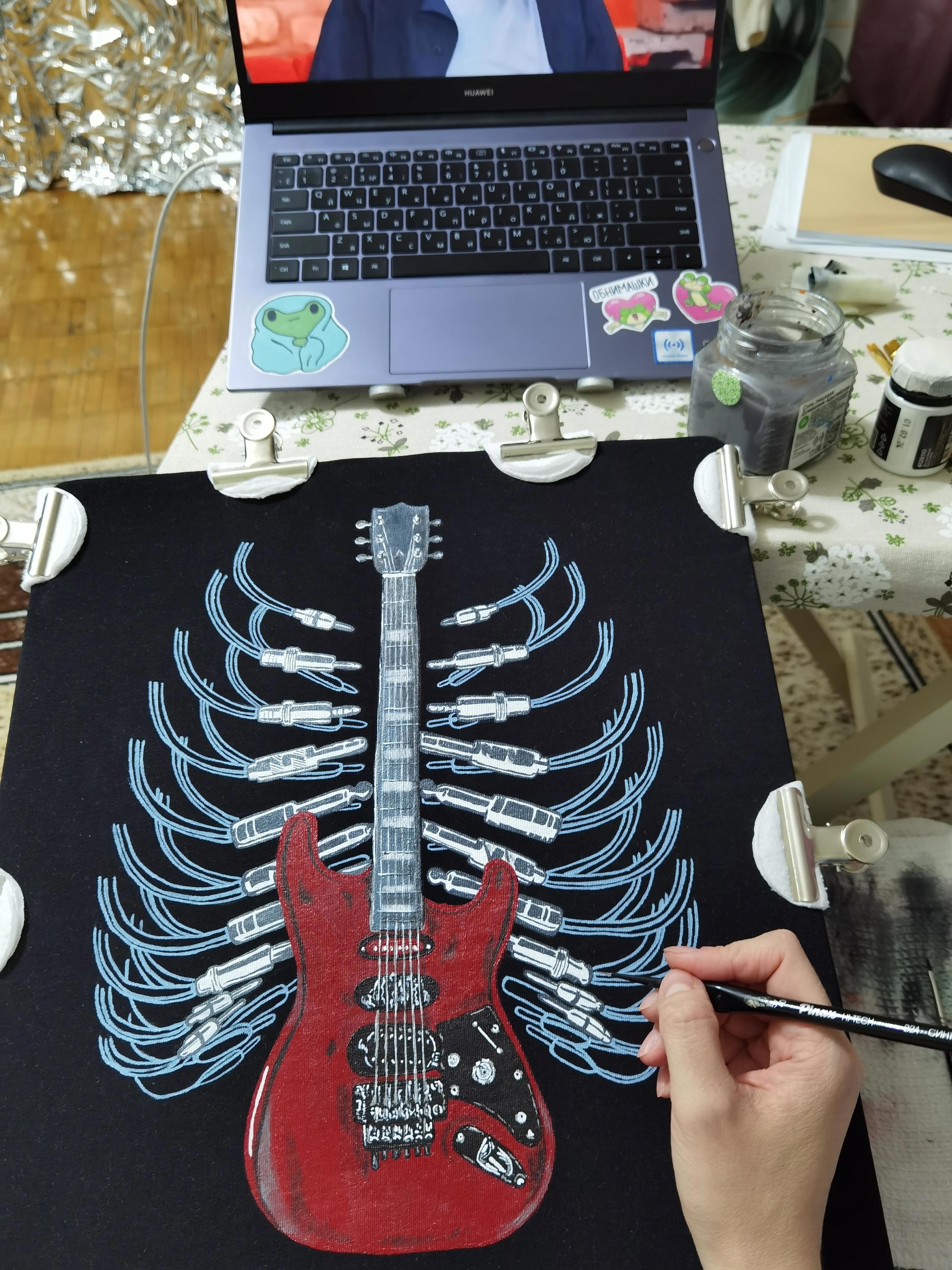 Нашла интересные картинки с гитарой и грифом. Придумала с ними дизайн, заказала футболку из плотной кулирки. И начала работу.
