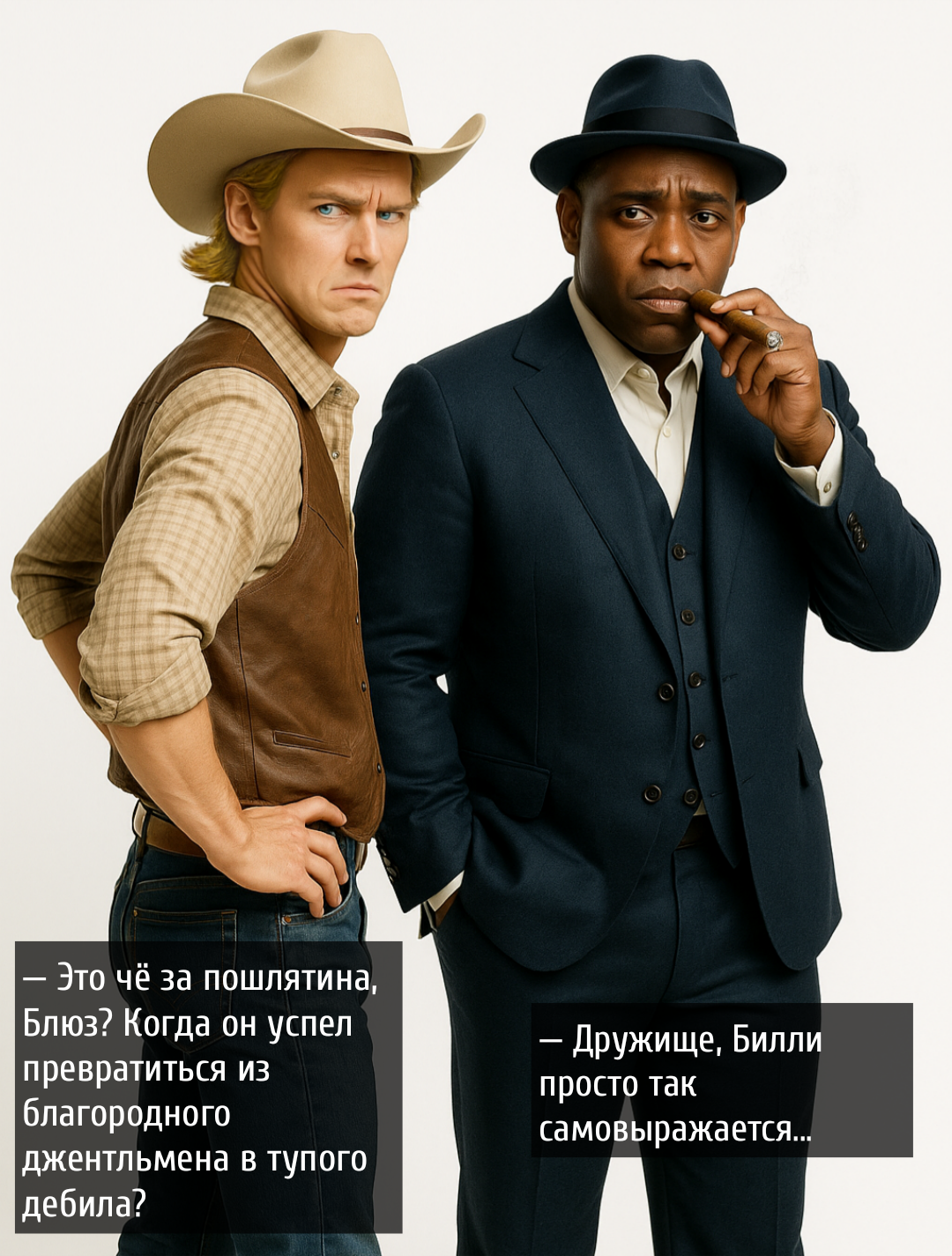 P. S. Для обывателей в подобном прикиде он реально выглядит как крутой брутальный металлист с мрачно-сексуальной харизмой, но для своих старших братьев Мистера Кантри и Мистера Блюза он навсегда останется их тупым маленьким Рокабилли/Билли, которого они когда-то учили держать гитару, а теперь он (по их мнению) тронулся башкой и просто выпендривается и так и сяк.