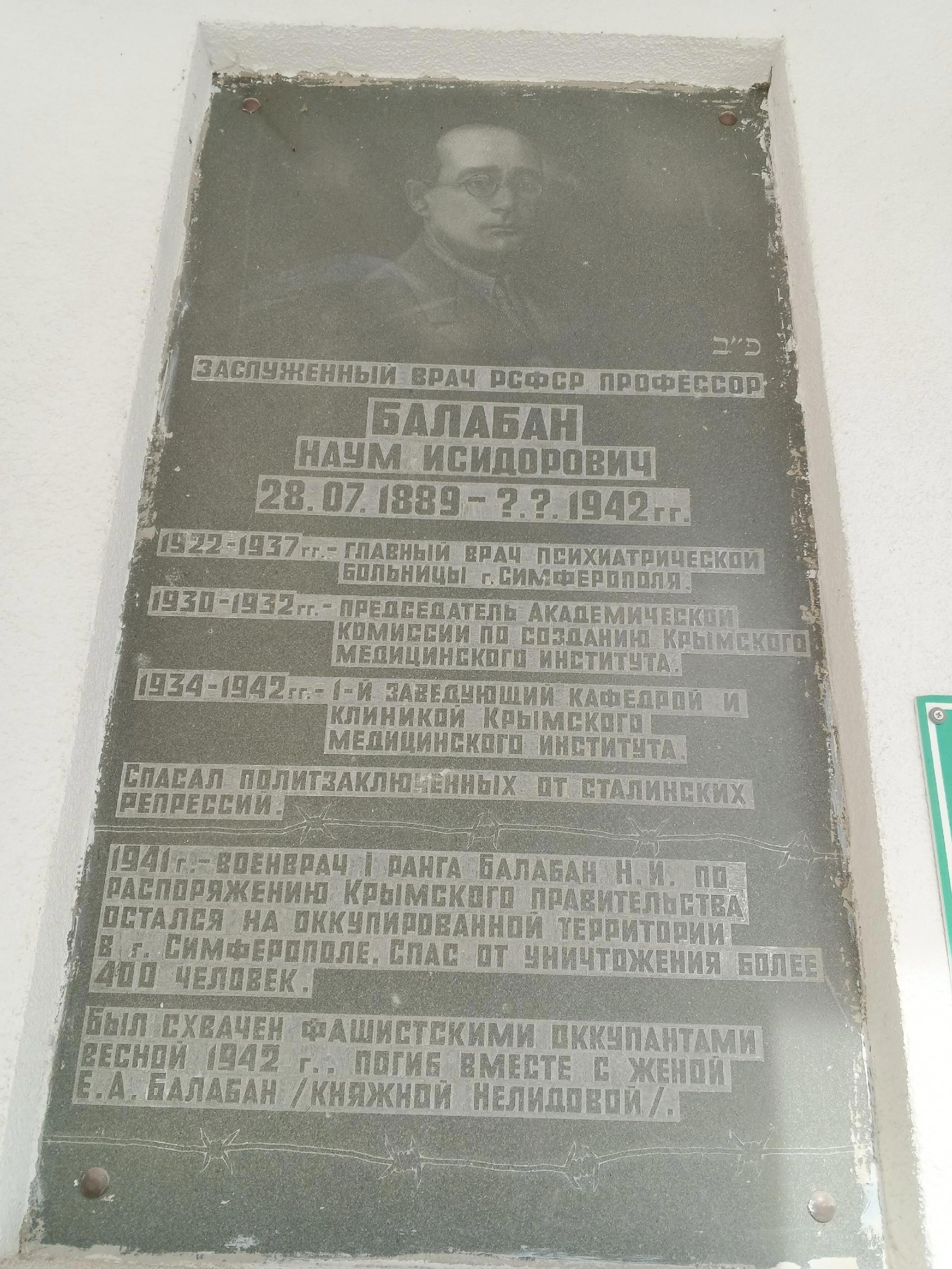 А дальше, ещё почти 20 лет Наум Исидорович отдавал жизнь и силы любимому делу - психиатрии. Больницу на ул. Розы Люксембург в то время называли не иначе как Балабановка. Более того, если в Симферополь приходило письмо без адреса но с надписью: Балабану или на Балабановку, то у почтальонов не было ни минуты сомнений, куда следовало доставить письмо.