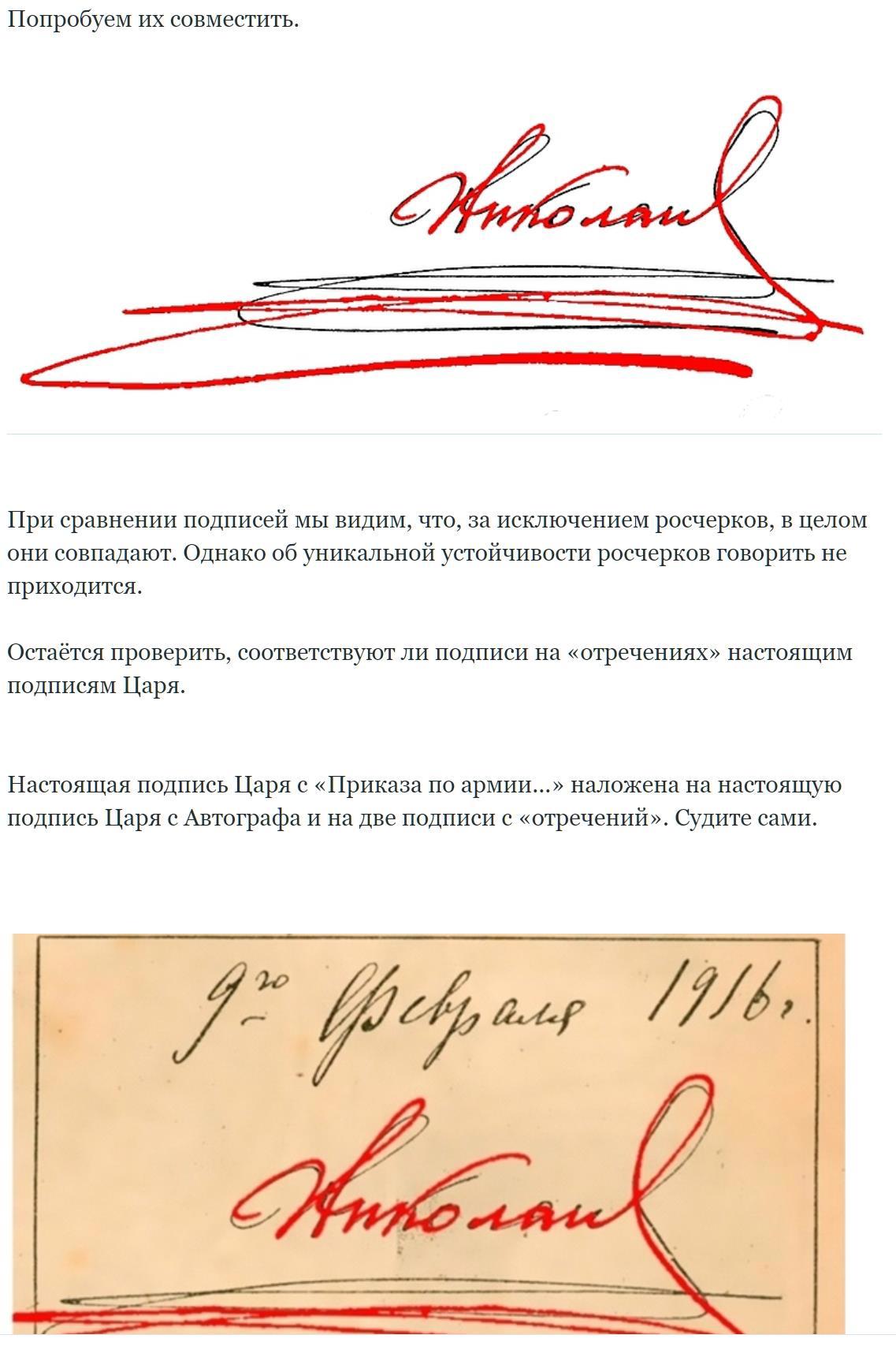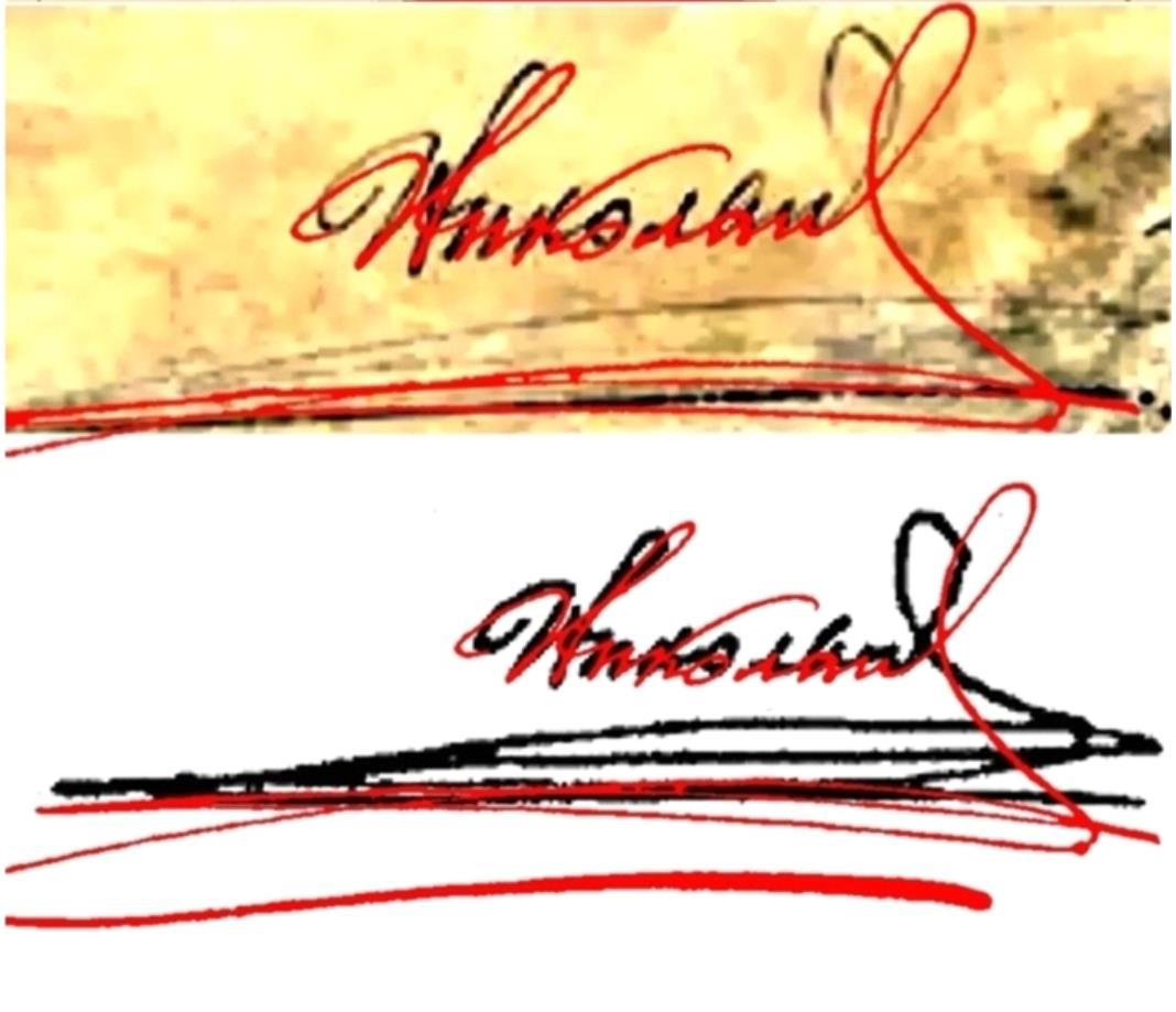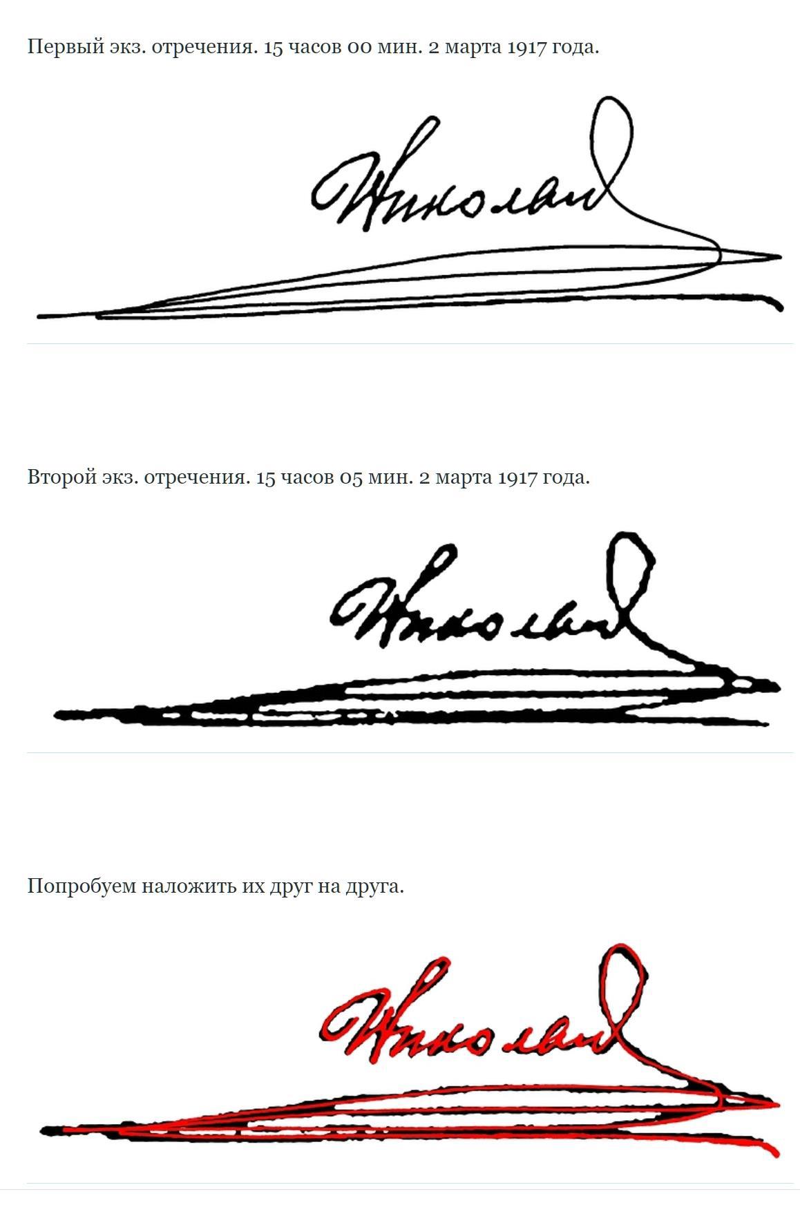 При наложении подписей проявилась весьма характерная особенность - два автографа с двух разных листов «отречения» абсолютно идентичны.