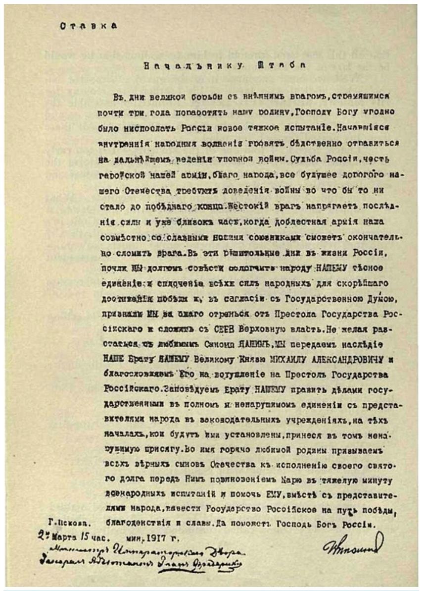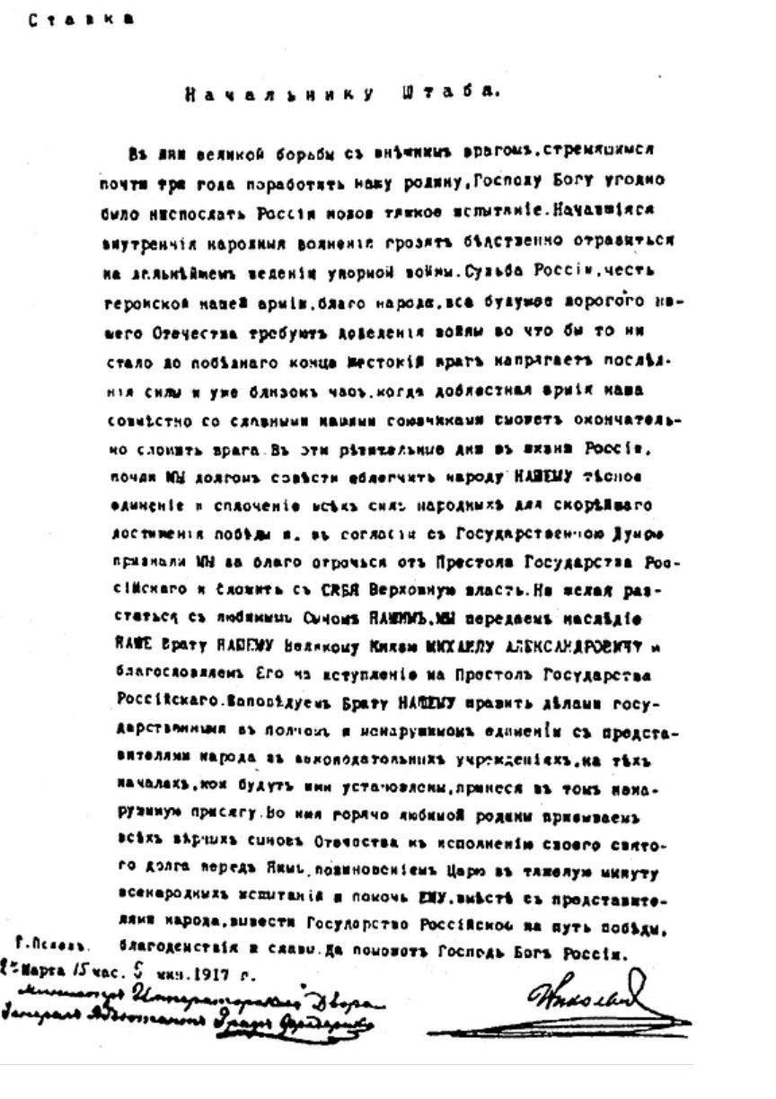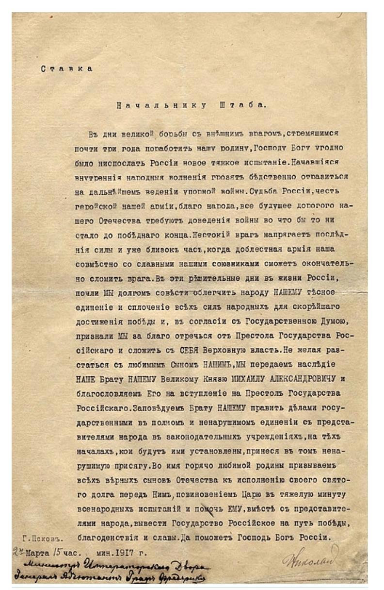 В дни великой борьбы с внешним врагом, стремящимся почти три года поработить нашу Родину, Господу Богу угодно было ниспослать России новое тяжкое испытание. Начавшиеся внутренние народные волнения грозят бедственно отразиться на дальнейшем ведении упорной войны. Судьба России, честь геройской Нашей армии, благо народа, все будущее дорогого Нашего Отечества требуют доведения войны во что бы то ни стало до победного конца . Жестокий враг напрягает последние силы , и уже близок час, когда доблестная армия Наша совместно со славными Нашими союзниками сможет окончательно сломить врага. В эти решительные дни в жизни России почли Мы долгом совести облегчить народу Нашему тесное единение и сплочение всех сил народных для скорейшего достижения победы и в согласии с Государственной думою признали Мы за благо отречься от престола государства Российского и сложить с Себя верховную власть. Не желая расстаться с любимым сыном Нашим, Мы передаем наследие Наше Брату Нашему Великому Князю Михаилу Александровичу и благословляем его на вступление на Престол Государства Российского. Заповедуем Брату Нашему править делами государственными в полном и ненарушимом единении с представителями народа в законодательных учреждениях на тех началах, кои будут ими установлены, принеся в том ненарушимую присягу. Во имя горячо любимой Родины призываем всех верных сынов Отечества к исполнению своего святого долга перед ним повиновением Царю в тяжелую минуту всенародных испытаний и помочь ему вместе с представителями народа вывести Государство Российское на путь победы, благоденствия и славы. Да поможет Господь Бог России.