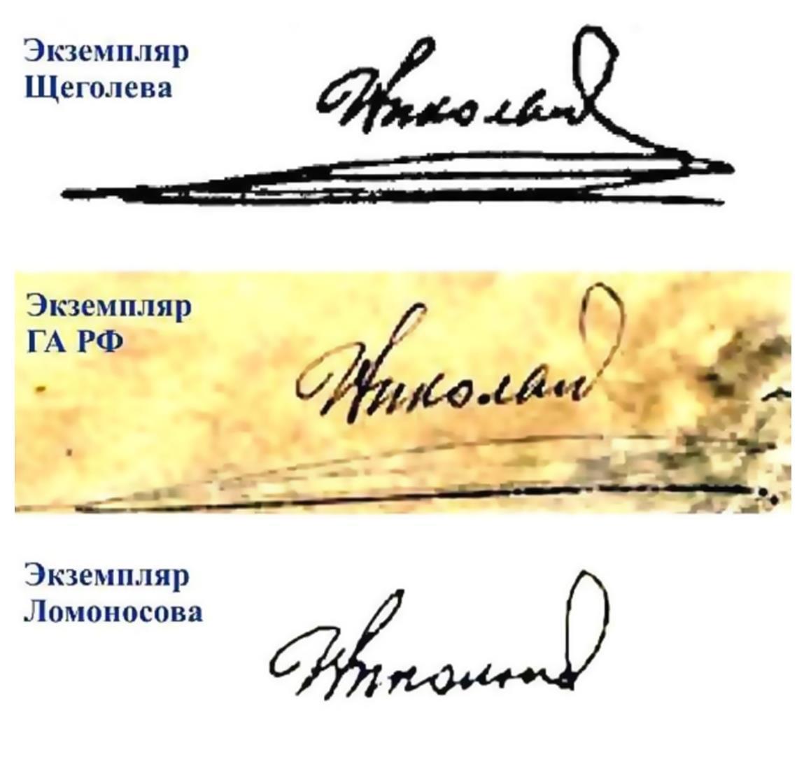 Убедиться в том, что это именно третий экземпляр, а не копия с первых двух, легко, сравнив «подписи Государя». Видно даже на глаз - они разные. Последняя имеет ярко выраженные отличия от первых двух. Смотрите:
