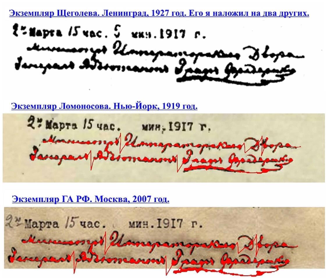 Меня удивила похожесть контрассигнирующих надписей графа Фредерикса на всех трёх «отречениях», и я сделал наложение трёх надписей друг на друга. Причём накладывал не слово на слово, а наложил ВСЮ НАДПИСЬ ЦЕЛИКОМ, ВСЕ СЕМЬ СЛОВ СРАЗУ, в две строки, с пробелами, промежутками и росчерками. Три автографа на трёх разных документах совпали до буквы.
