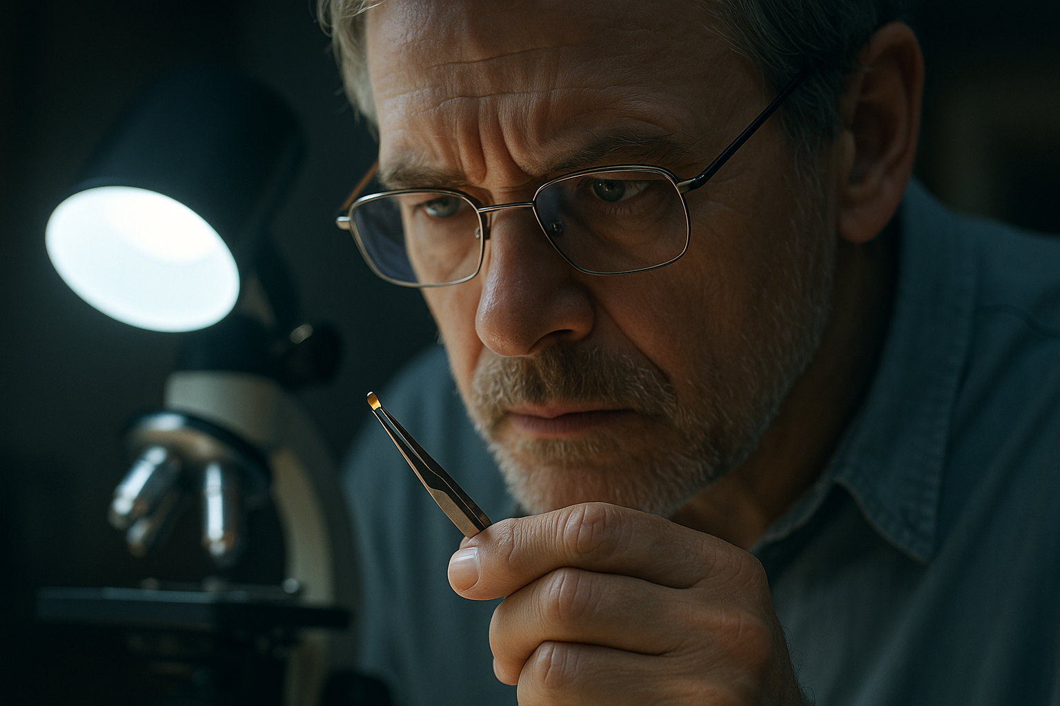 "Юрий Геннадиевич склонился над микроскопом, вооруженный пинцетом. Под белой лампой мерцали кроешчные янтарные капсулы — каждая с рисовое зёрнышко. Полупрозрачные, с едва различимыми тонкими прожилками.
