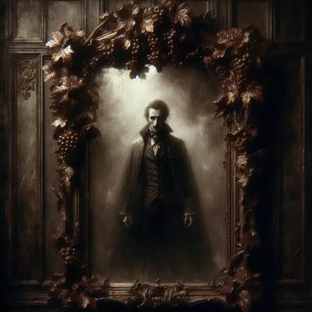A vampire visible in the dark haze of a large full-length mirror's reflection. The mirror's frame is decorated with bronze grape leaves and bunches. Baroque style. somber and tenebrous, rough texture, аrt by Gustave Moreau, Francisco Goya and Pre-Raphaelites