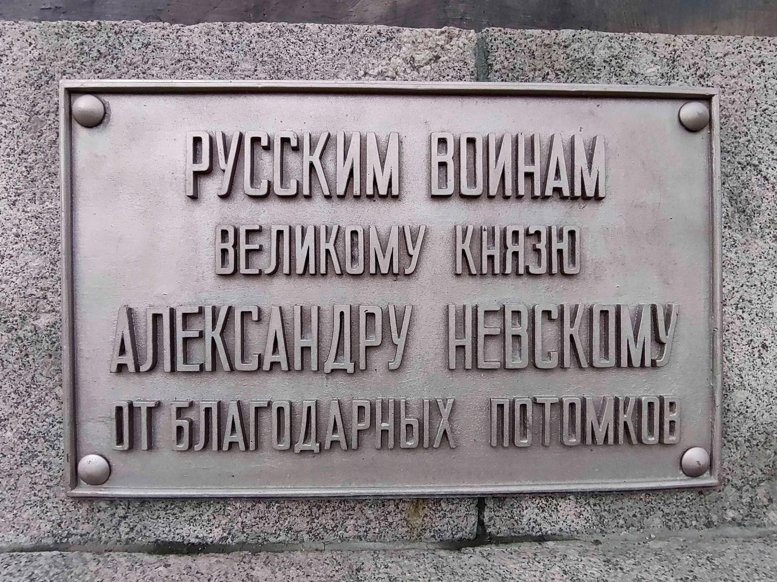 Правда табличка, на мой взгляд, какая-то слишком политкорректная – не написано за что поставлен памятник, за победу над кем и когда. Если специально не интересовался и не знаешь истории — даже не ясно кого наши побили. А знать надо. Написано просто — «Александру Невскому и русским воинам».