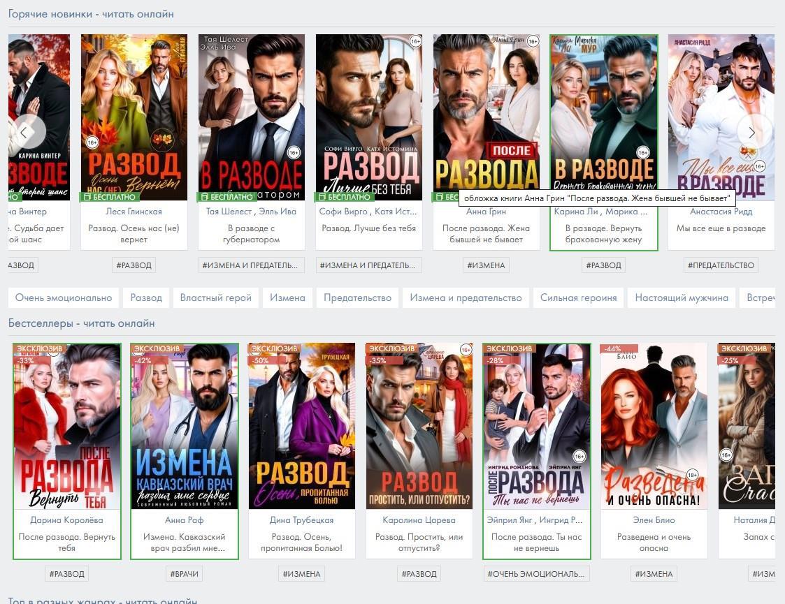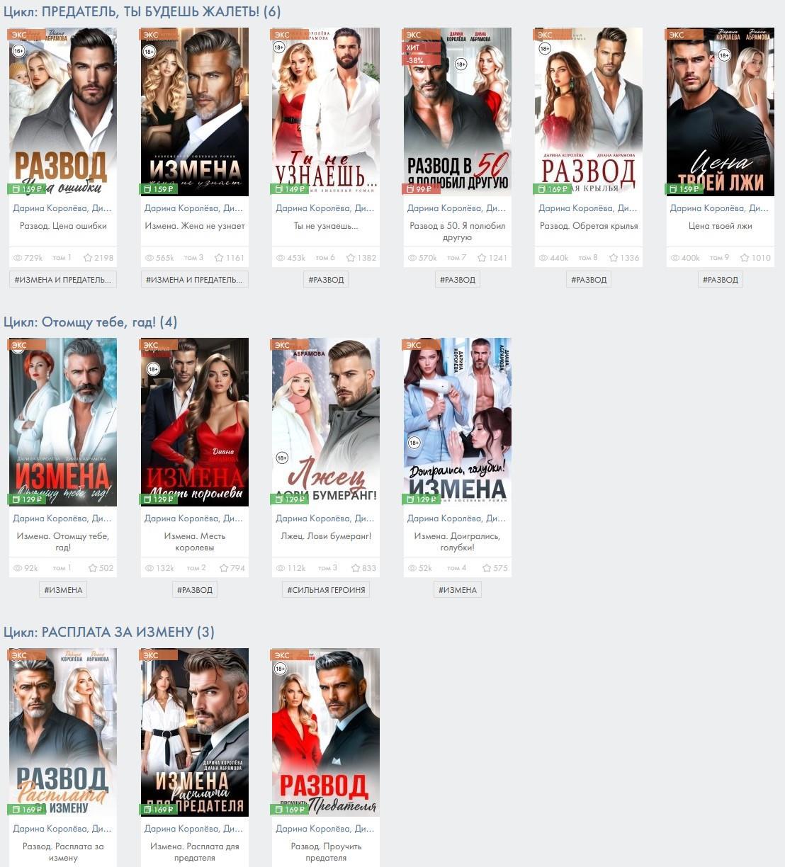 Ну давайте глянем. Возьмем одну даму из тамошнего топа и посмотрим чего у нее есть в циклах:Один цикл про измену и развод, второй цикл про измену и развод... Третий цикл про измену и развод...