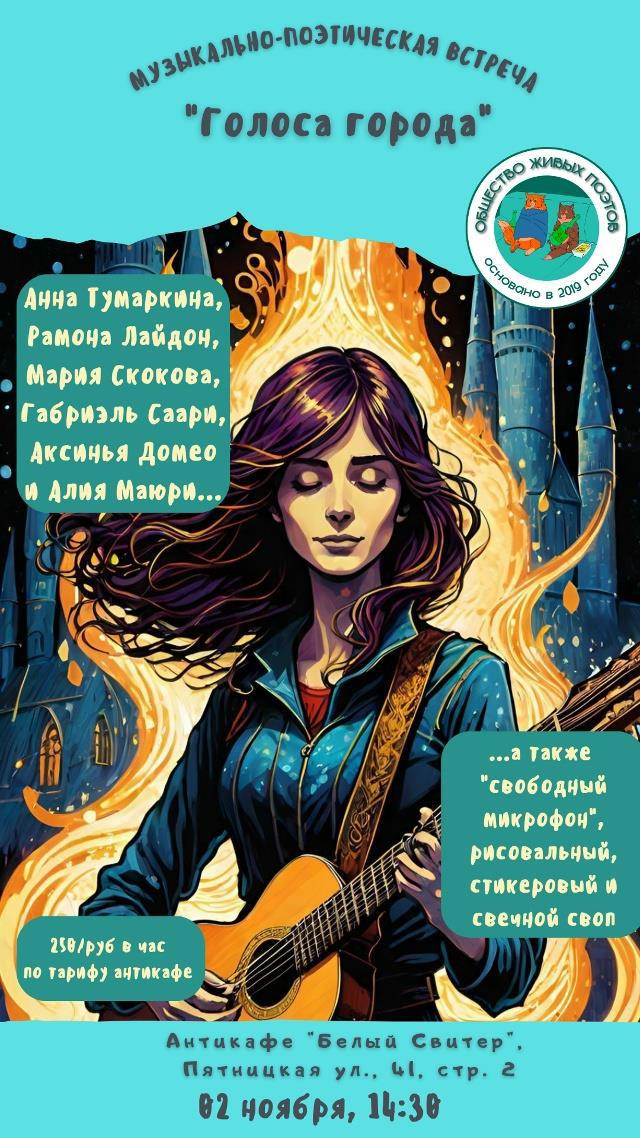 Сказительница , и их друзья приглашают вас 02 ноября в воскресенье посетить встречу "Голоса города", которая состоится в антикафе "Белый свитер" ~