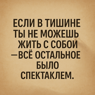 Я ловлю себя на том, что даже в тишине продолжаю играть. Внутри больше нет покоя — только внутренний зритель, который оценивает каждую мысль: «это звучит глупо», «это никому не нужно», «это не купят». И я вдруг понимаю: я боюсь не тишины. Я боюсь быть собой без грима.