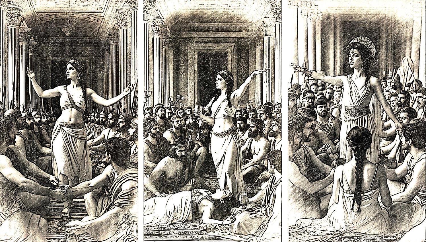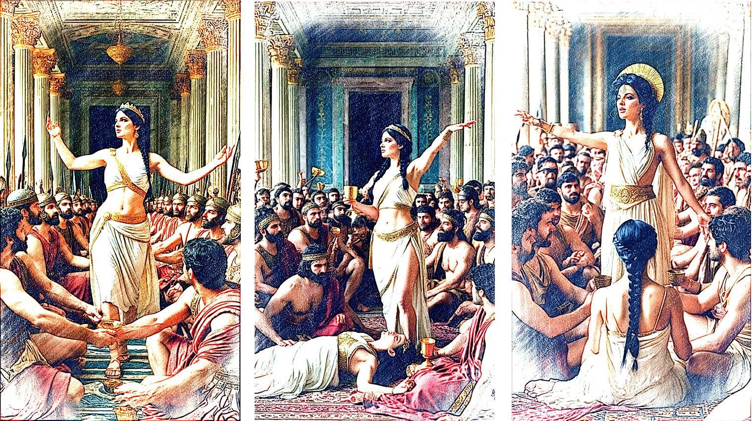Шум в зале постепенно стих и Таис заговорила. Неожиданно для неё самой её голос гулко отразился от стен дворца и загремел над головами пирующих воинов.