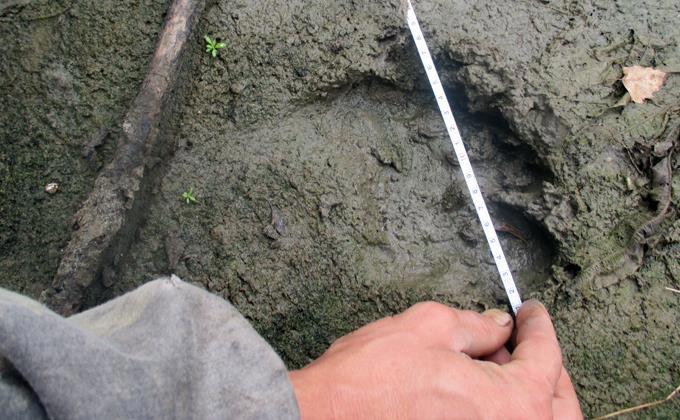 Причём, наступает, судя по следам, он как-то странно: носками внутрь, да и ширина следа широкая.