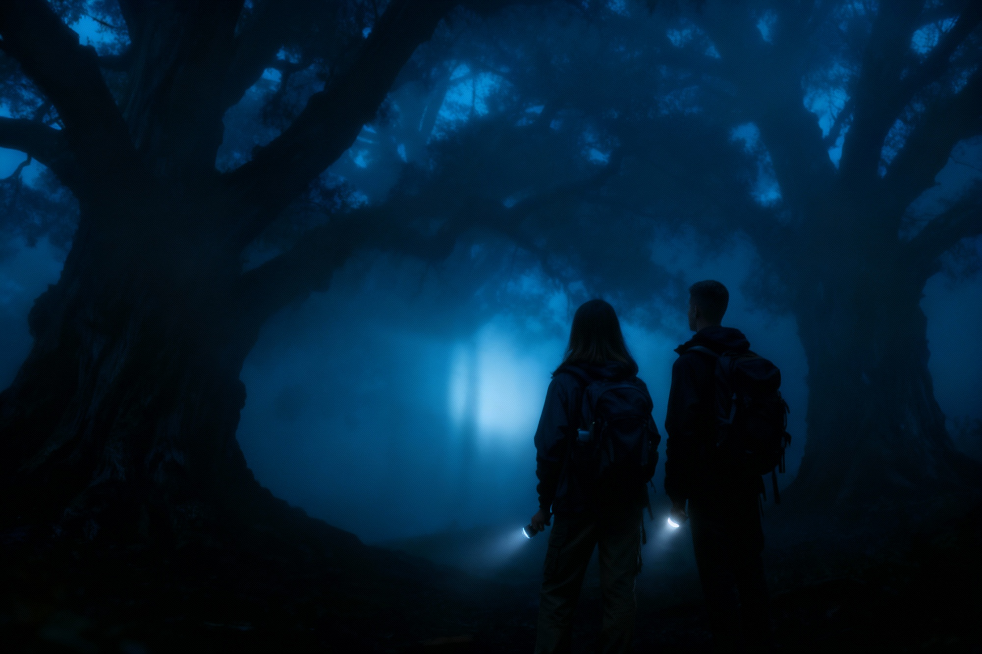Яркие лучи света озарили округу. Два фонаря бессильно упирались в белую пелену тумана. Где-то вдали зашелестели листья, будто поднялся ветер. Они осмотрелись в надежде почувствовать свежий ветерок, который разгонит мглу. Вместо этого шелест только нарастал, обвивая их со всех сторон.