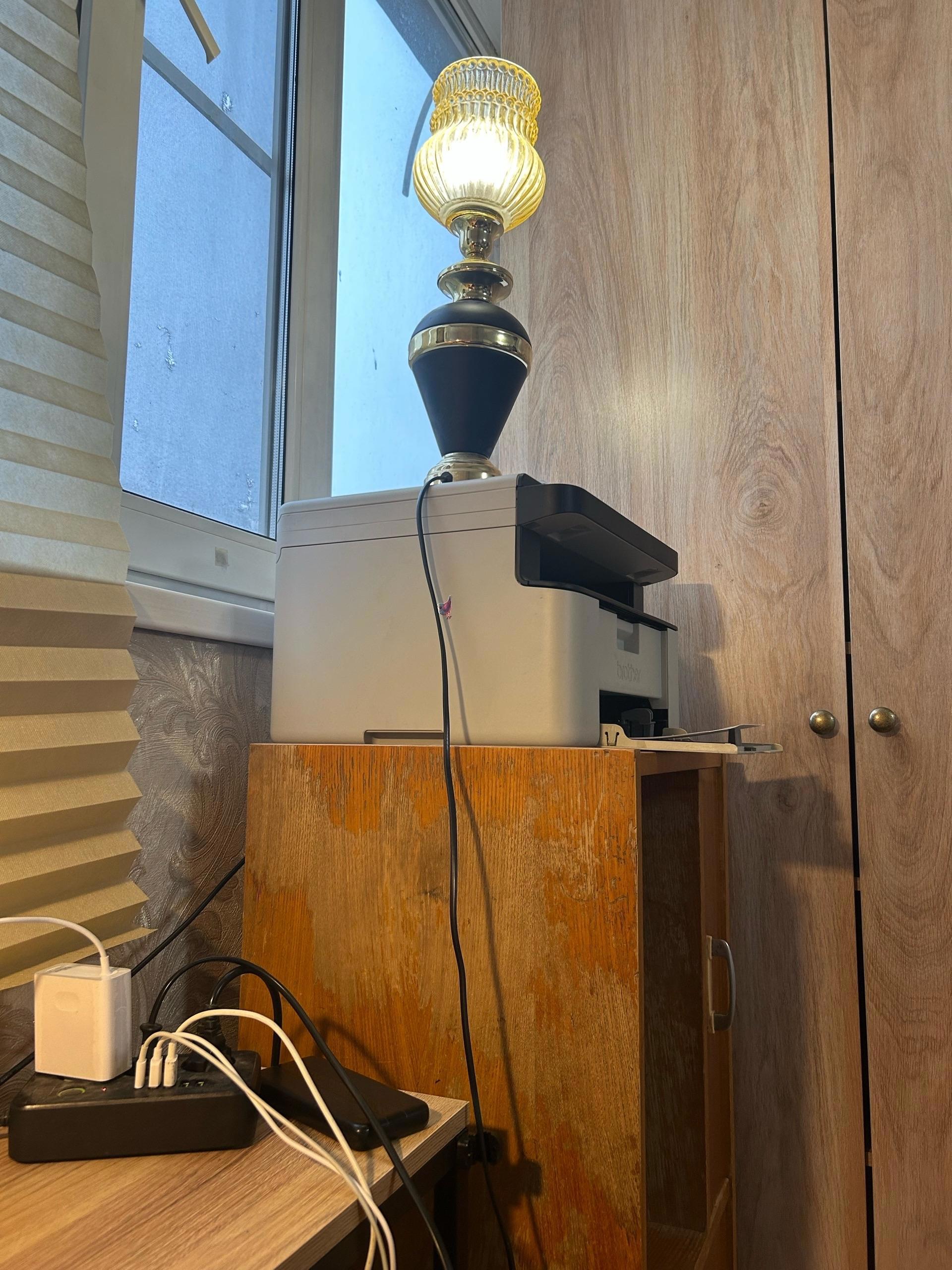 Ну а третье - это освещение. Купил новую лампу (у старой совсем разболталось крепление) и поставил прямо над компом, а также достал из шкафа ещё одну старую лампу и воздрузил её на принтер. Так что у меня теперь есть источники освещения и спереди и сзади. Очень удобно, рекомендую.