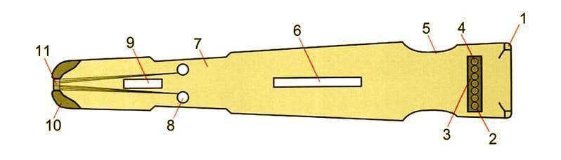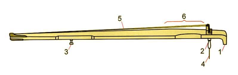 6. «Склонённая голова» — отчётливый скос деки, примерно от метки 3-го лада, чтобы при зажиме струн обеспечить оптимальное расстояние между струнами и поверхностью инструмента.