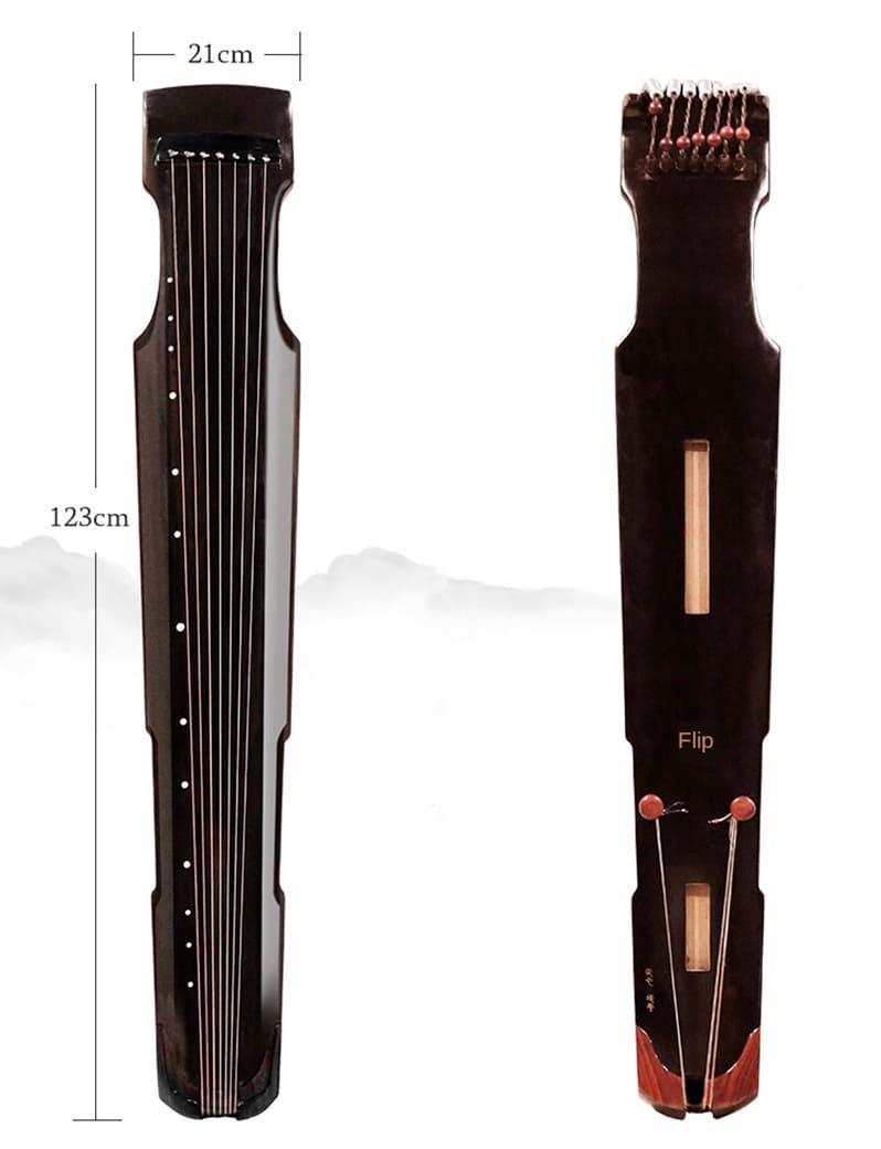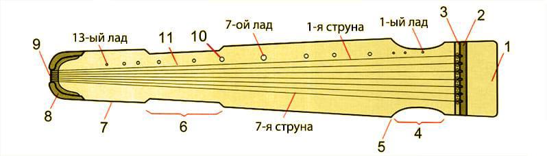Корпус инструмента состоит из двух половин: верху выгнутый, а снизу плоский. Такая форма символизирует древнее понятие китайцев о мире: небо круглое, а земля плоская. Длина корпуса 100-120 см., ширина около 20 см. На деке помечены 13 ладов.