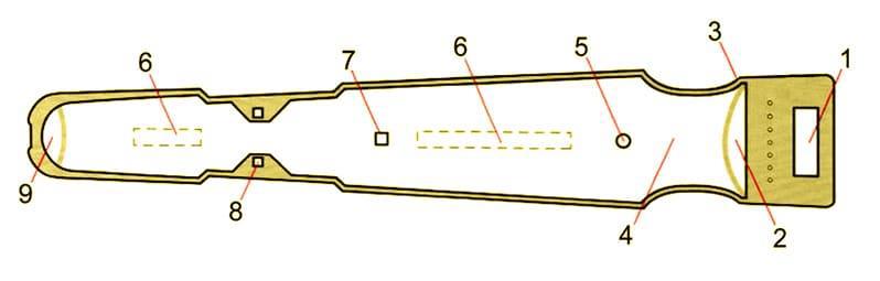 6. «Поглотители звука» — один в «Озере Дракона», а другой в «Пруду Феникса». Служат, для сдерживания звука, чтобы звук был не слишком пуст и без нежелательных призвуков. Звукопоглотители бывают двух типов, «наинь» и «ложный наинь». Отличие в том, что «Ложный наинь» делают не цельным, выступающим в полости инструмента, а, изготовив, устанавливают его туда.