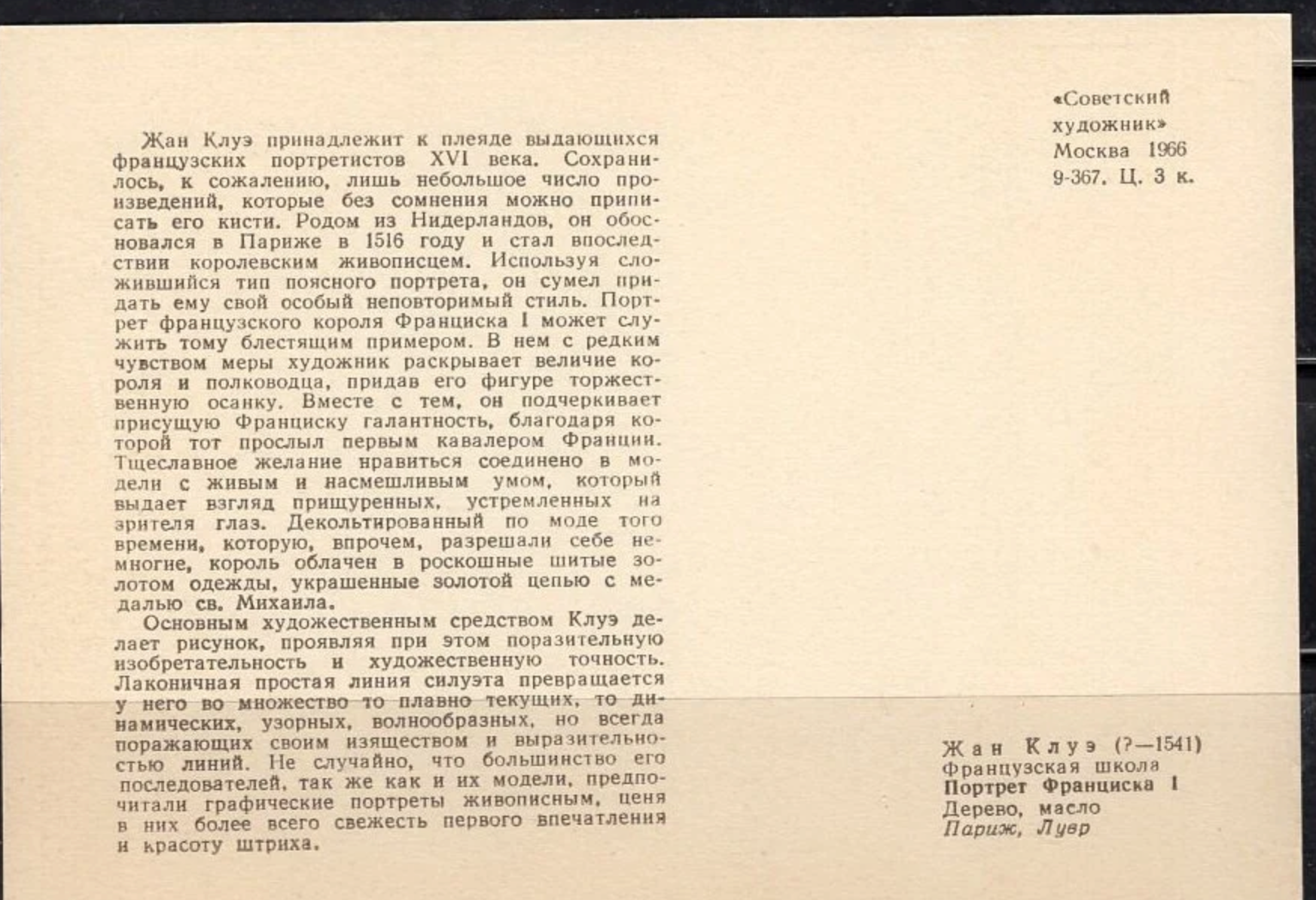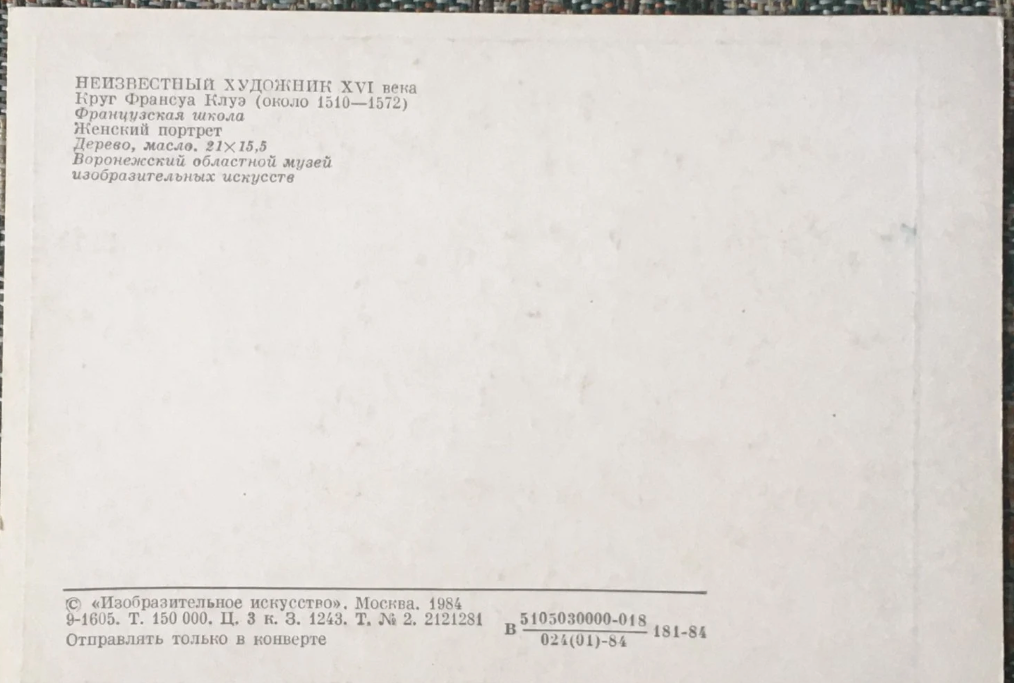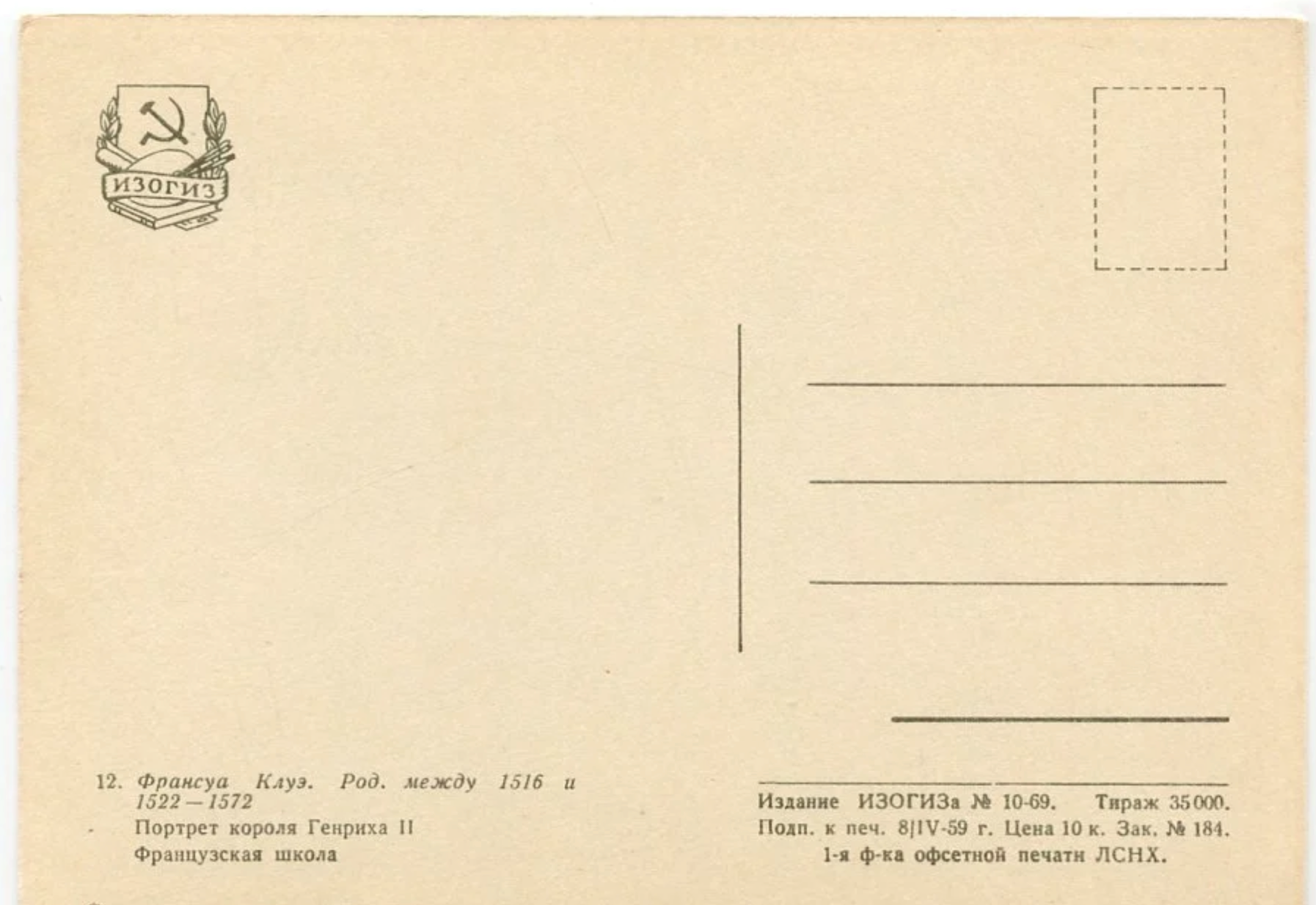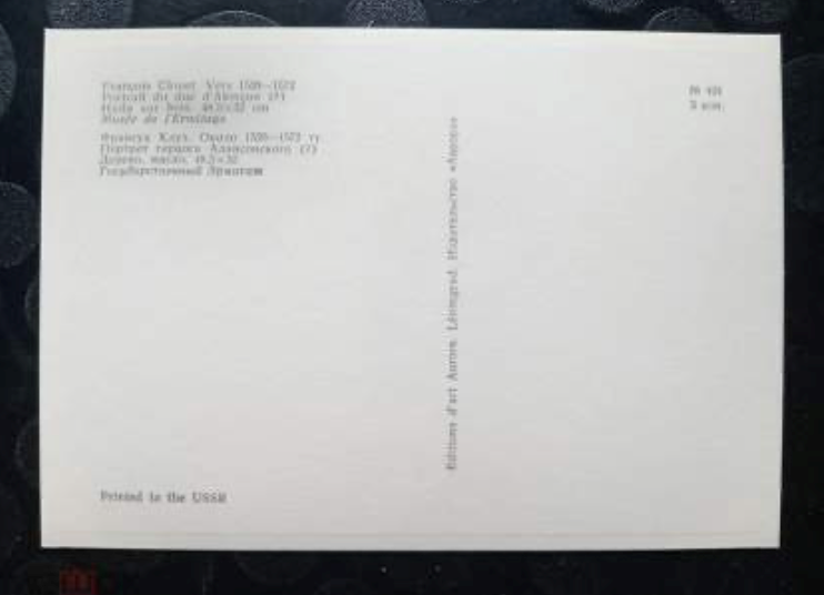 Вот такие открытки... И большая часть - это почтовые карточки для писем. Так что пишите, товарищи и граждане свои письма на портретах работы Клуэ и шлите их почтой СССР.