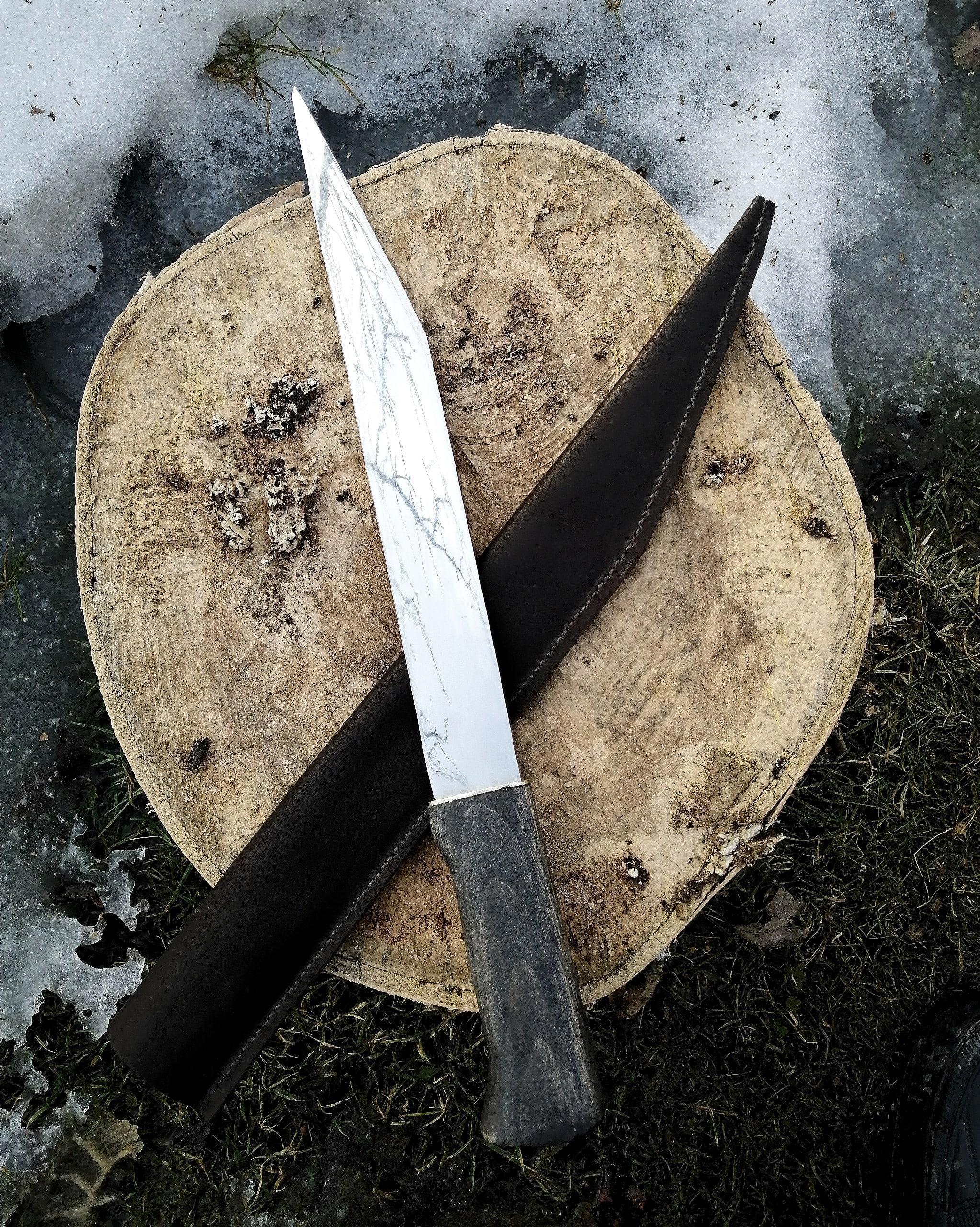 Ниже моя версия сакса (скрамасакс): общая длина составляет 45 см. Ножны у меня простые, кожаные