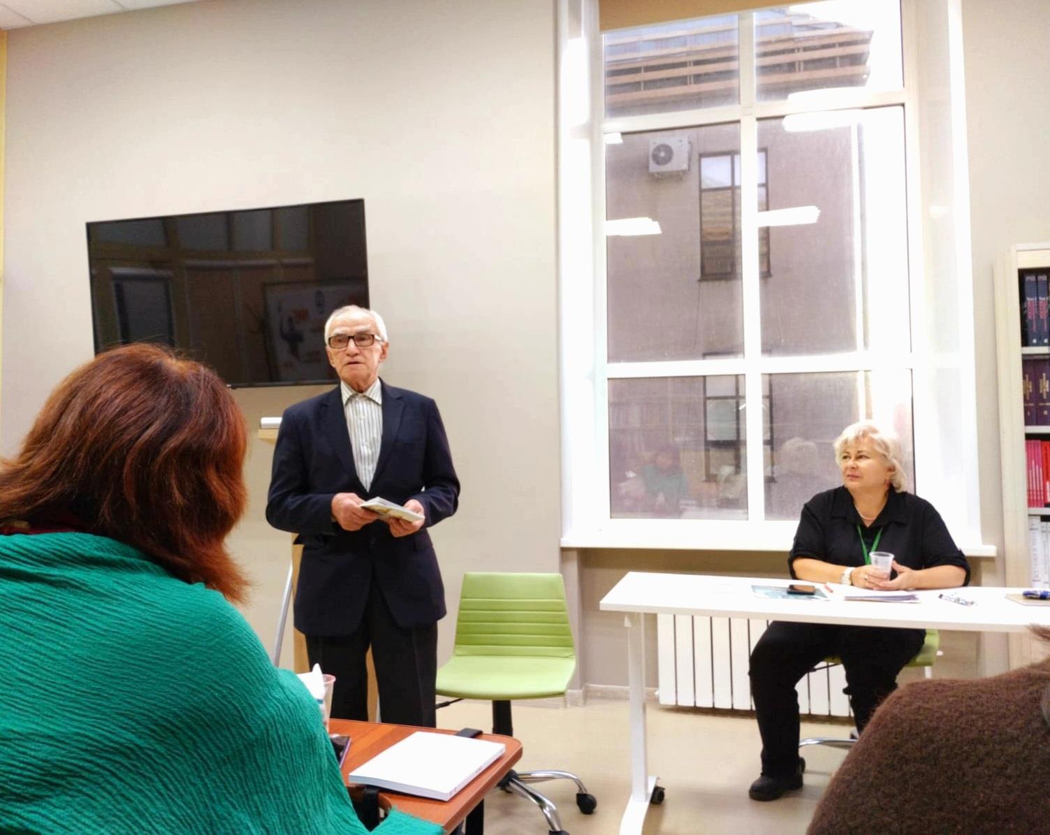 К нам в гости заходил поэт Евгений Ермаков (член Союза писателей России). Евгений Анатольевич рассказал о себе (долгий творческий путь от писателя-сатирика, автора юмористического журнала "Крокодил" до автора многих книг духовной поэзии) и прочёл два цикла своих стихотворений: один цикл православных стихов был посвящён Богородице, а второй - нашему родному городу...
